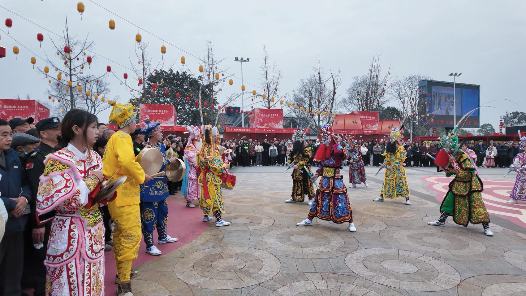 锣鼓声陡然转急,英歌舞演员身着艳丽戏服、脸上绘着梁山好汉脸谱,双手紧攥英歌槌,迈着刚劲有力的步伐登场。他们挥槌击节、腾挪跳跃,跟着鼓点节奏灵活变换阵法队形,动作整齐划一、气势磅礴,现场欢呼声一波盖过一波,新春氛围愈发浓厚。