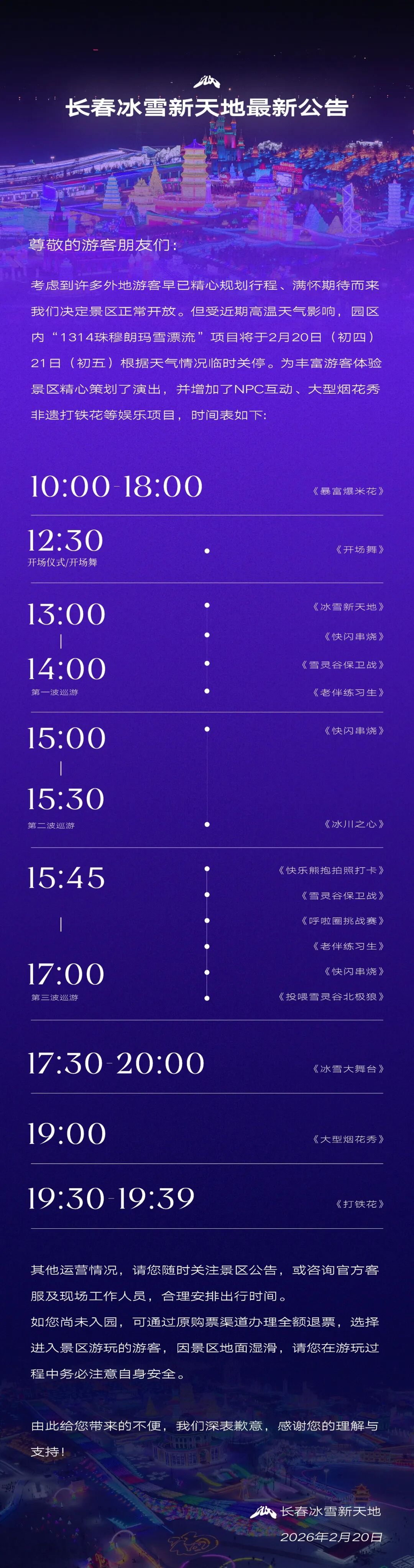 2月20日,长春天定山订阅号发布长春冰雪新天地最新公告,具体内容如下: