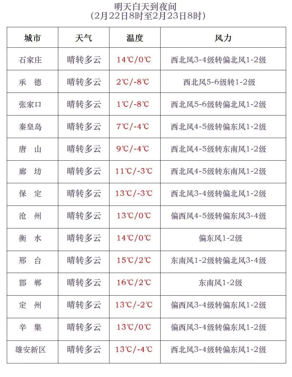 河北省气象台2026年2月21日11时发布天气预报: