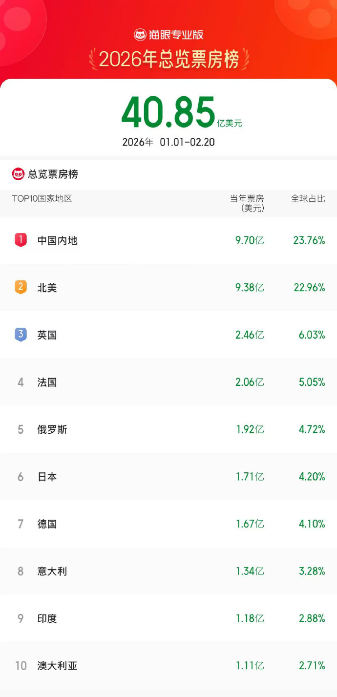 2月21日,据猫眼专业版数据显示,2026年中国电影市场累计票房超9.70亿美元,超北美票房成绩,暂列全球单一市场票房冠军。
