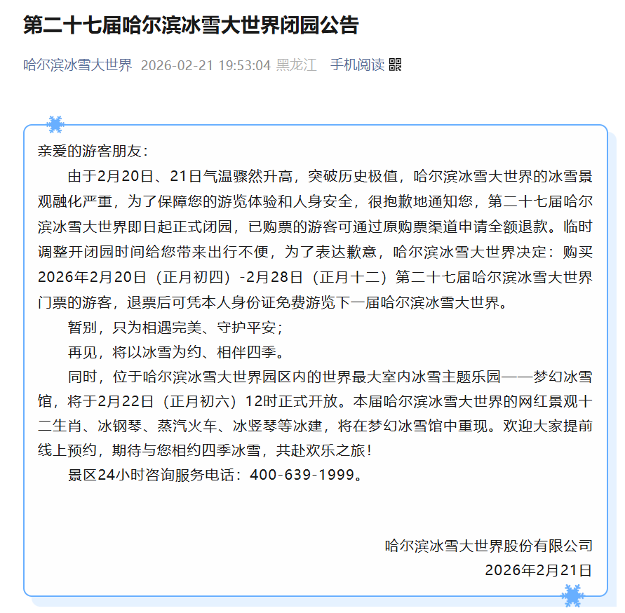 今日晚间,哈尔滨冰雪大世界发布公告:由于2月20日、21日气温骤然升高,突破历史极值,冰雪景观融化严重,第二十七届哈尔滨冰雪大世界即日起正式闭园,已购票的游客可通过原购票渠道申请全额退款。