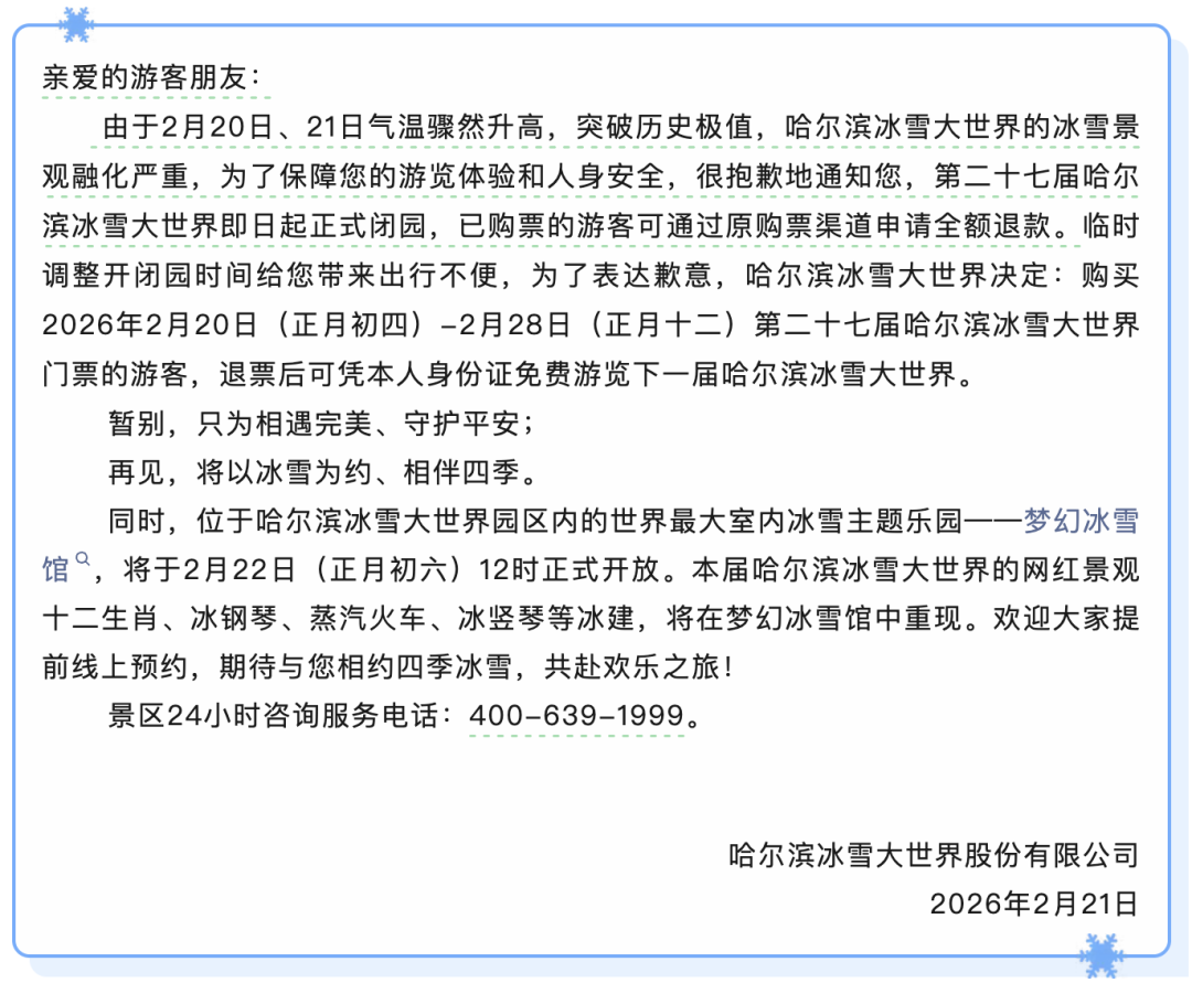 2月21日晚,哈尔滨冰雪大世界发布闭园公告: