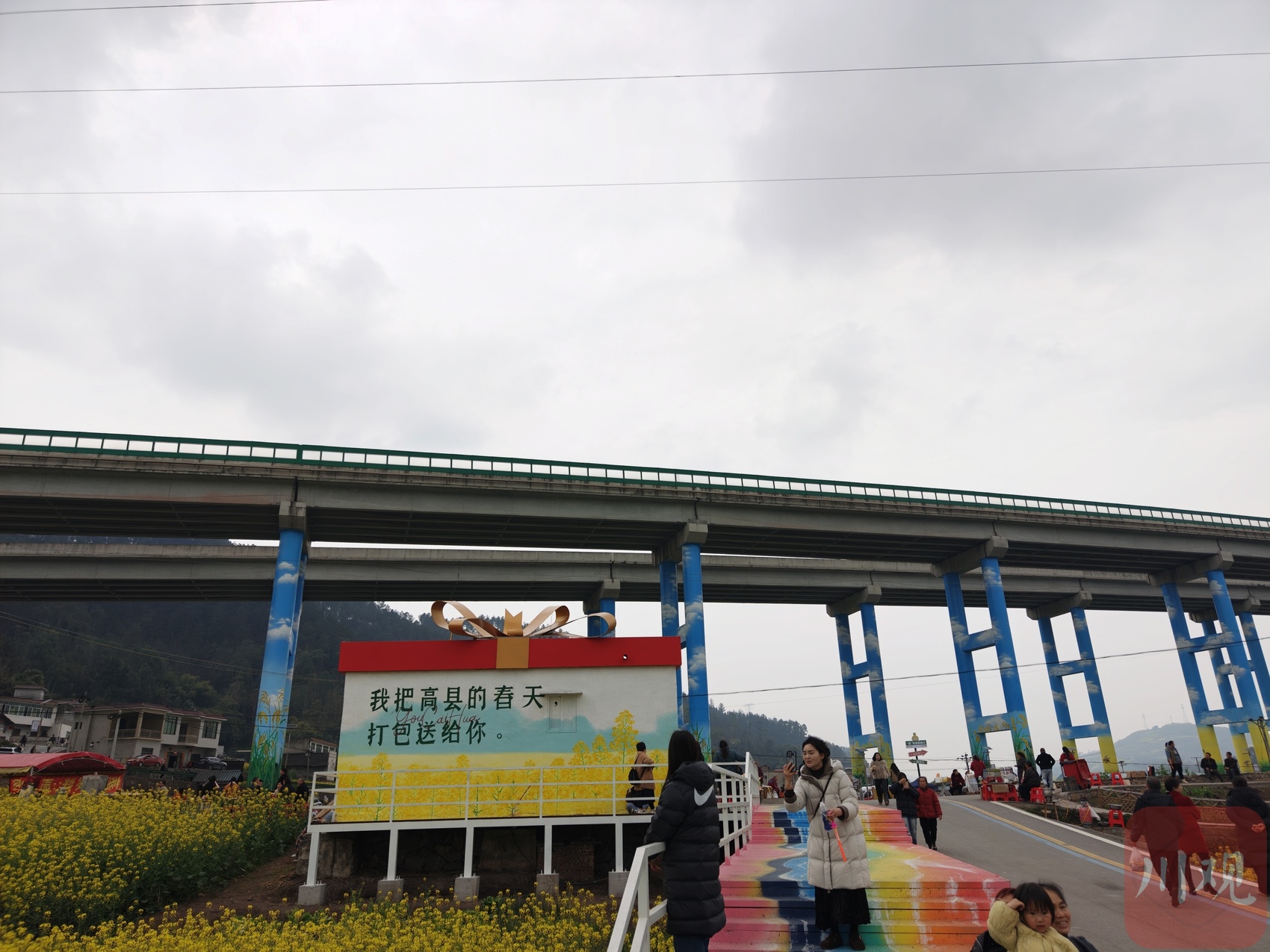 艺术的气息也在花海里蔓延开来。灰白的高速路桥墩,如今披上了彩虹般的巨幅涂鸦,画的是春日的油菜花盛景。来自成都的游客李晓和男友站在桥下前自拍,“完全没想到,冰冷的混凝土能和这么温暖的画、这么美的花海融为一体,太震撼了。”