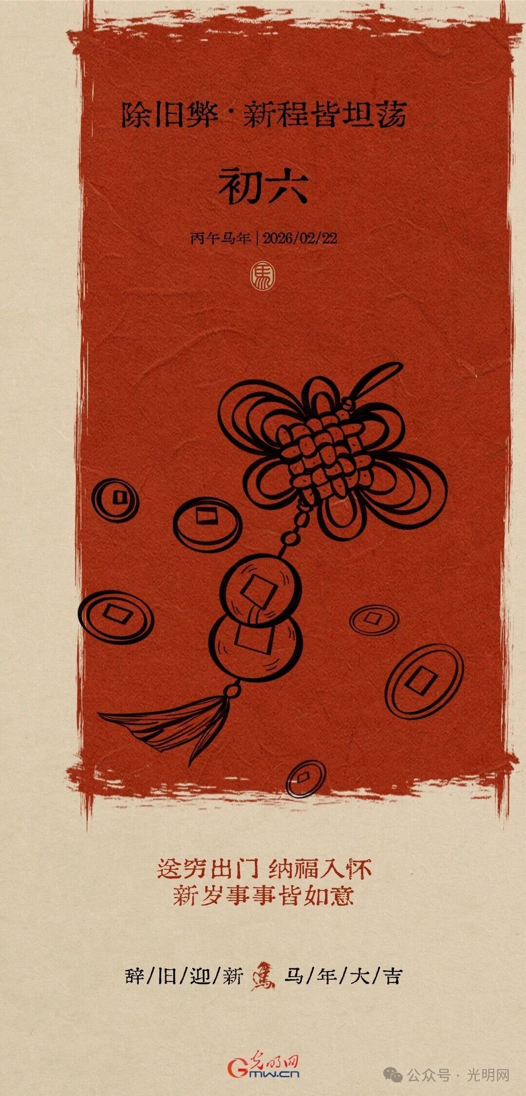 #丙午马年引爆年味 送穷启运,六合同春愿你送走旧岁的烦恼与困苦,迎来新年的富贵与吉祥。财源广进,福禄双全,日子红火,人生顺利。六六大顺,好运连连!