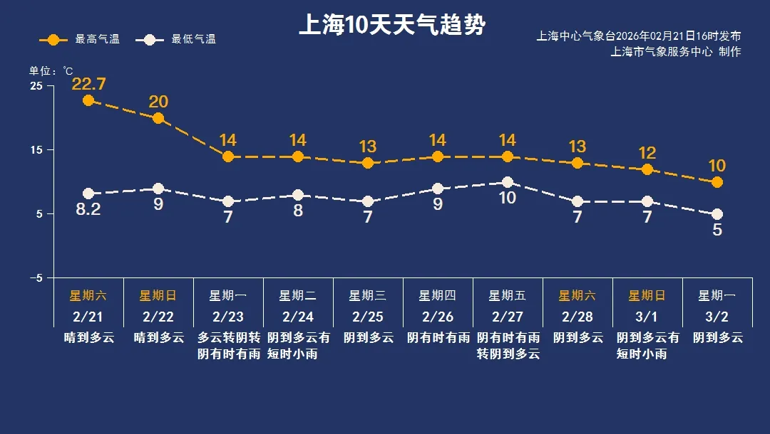 据上海天气发布,大年初七、初八(23~24日)上海气温下滑,还将出现大风和降雨,主要降水时段为23日(初七)夜间,雨量中等,24日有短时小雨。正值返程高峰,请朋友们注意道路交通安全。下周气温整体下降一台阶,最高气温在12~14℃之间,最低7~10℃,同时阴雨天气增多,体感较阴冷,请及时关注最新预报。