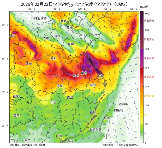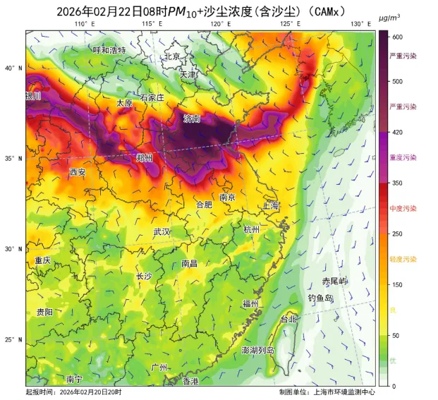 根据最新预测预报情况,22日凌晨起,沙尘气团开始影响长三角地区,预计中午前后影响本市,出现短时中度及以上污染过程;23日凌晨,本市主导风向转为东北风,沙尘气团逐渐过境,中午前后沙尘影响基本结束,空气质量好转为优良。