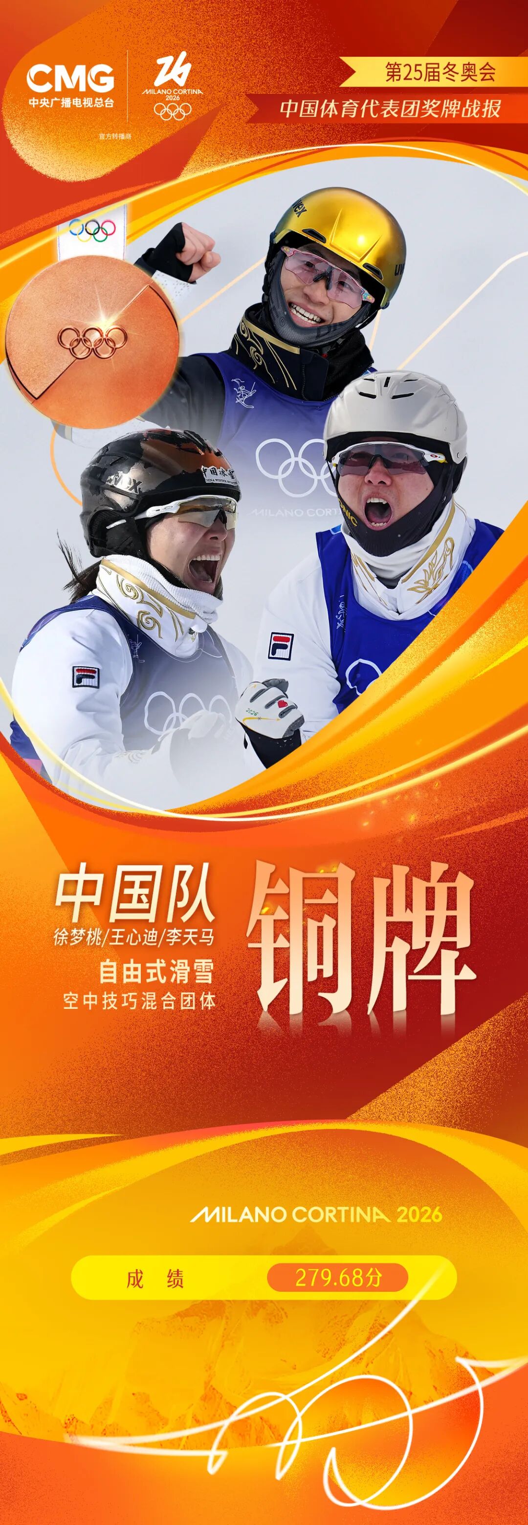 米兰-科尔蒂纳冬奥会,自由式滑雪空中技巧混合团体决赛,由徐梦桃、王心迪、李天马三人组成的中国队夺得铜牌!