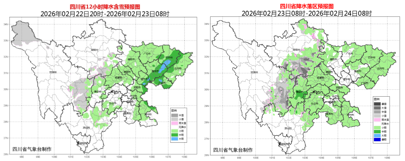 四川省气象台预计,22日晚上,盆地大部阴天有阵雨或雷雨,巴中、南充、广安3市及遂宁、资阳、泸州3市东部和达州西部有中雨,个别大雨;阿坝州南部、甘孜州北部东部和凉山州东北部阴天间多云有阵雪或阵雨,局地中雪,川西高原和攀西地区其余地方多云。