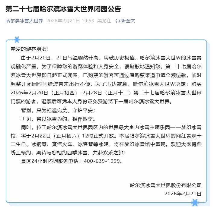 由于2月20日、21日气温骤然升高,突破历史极值,哈尔滨冰雪大世界的冰雪景观融化严重,为了保障您的游览体验和人身安全,很抱歉地通知您,第二十七届哈尔滨冰雪大世界即日起正式闭园,已购票的游客可通过原购票渠道申请全额退款。临时调整开闭园时间给您带来出行不便,为了表达歉意,哈尔滨冰雪大世界决定:购买2026年2月20日(正月初四)-2月28日(正月十二)第二十七届哈尔滨冰雪大世界门票的游客,退票后可凭本人身份证免费游览下一届哈尔滨冰雪大世界。