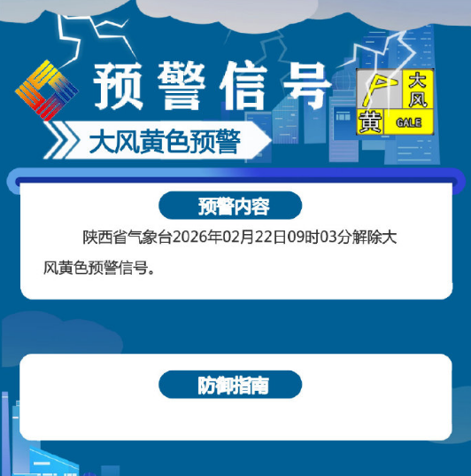 此外,陕西省气象台2026年02月22日09时03分解除大风黄色预警信号。