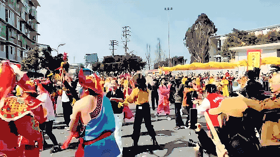“来了!来了!”伴随着欢呼声,英歌舞队员踏着铿锵鼓点开演。丹棱市民文元珍跟着队伍跑了一路,挤得满头大汗:“头发都挤散了,但高兴啊!好多年没见过这么闹热了!”