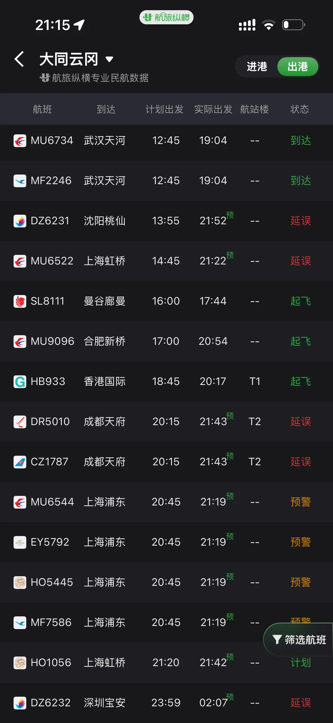 根据航旅纵横APP显示的信息,山西大同云冈机场受到的影响则更为严重,21日白天的航班延误几乎都在七八个小时,白天的航班全部延误到晚上才出发。