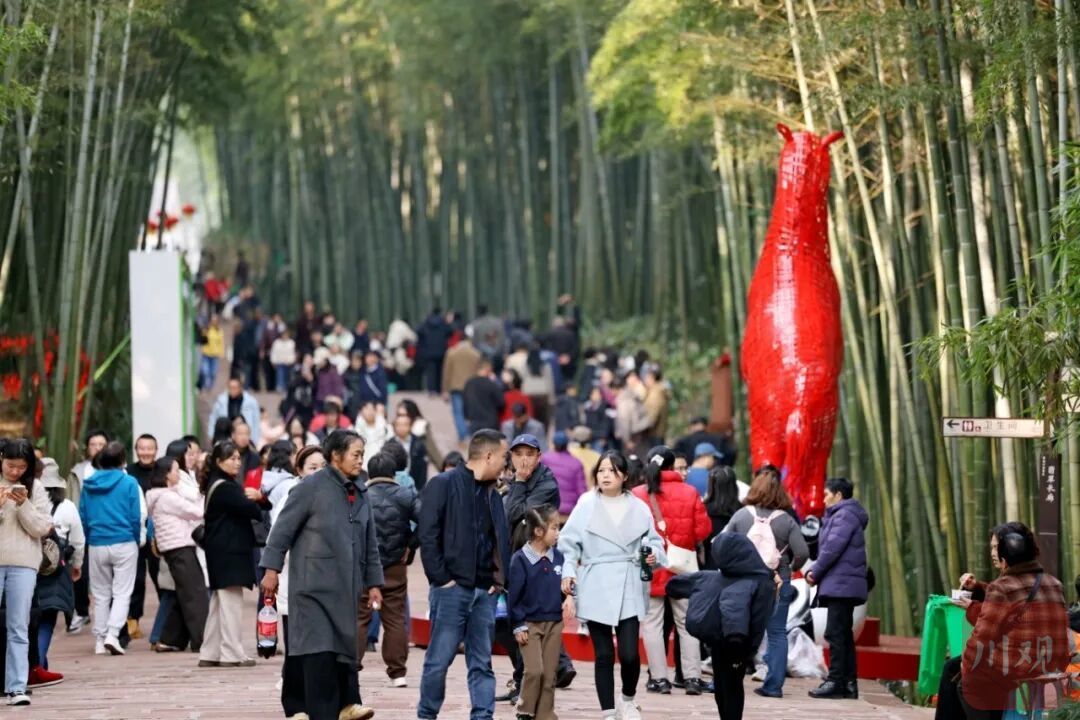 春晚节目《立上游》中,演员策马穿行竹海的镜头,将东方意境之美送上荧幕,也让“竹林跑马”成为游客争相体验的热门项目。景区特意引入专业马术运营团队,让游客不仅能看“福马”,更能亲身骑“福马”。刚从马背上下来的德阳游客赵迅驰难掩激动:“看到春晚里骑马从竹林穿过,感觉特别帅气。现在自己也能骑着马跑一圈,像是走进了春晚画面里,太棒了!”