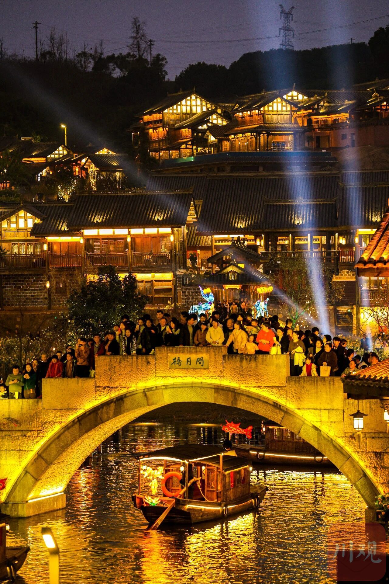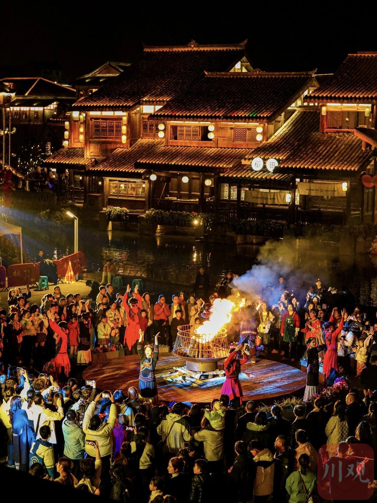 夜幕降临,李庄文化旅游度假区灯火璀璨。水上表演以水为幕、以光为笔,灵动光影在水面跳跃;两只“凤凰”无人机腾空而起,在夜空中与缓缓升空的孔明灯交相辉映,将古镇的年味推向高潮。