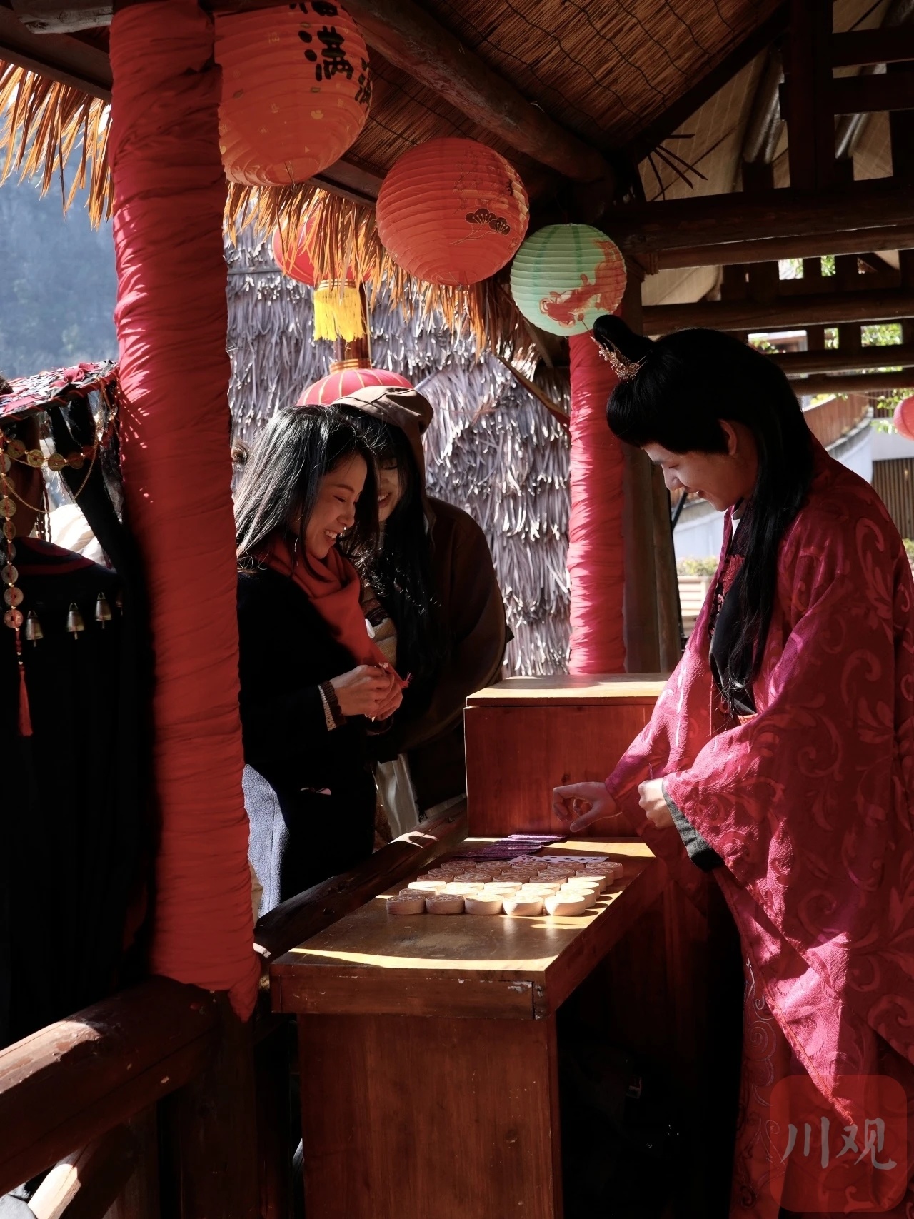 除了光影震撼,古镇里的“乾道嘉游园会”更是烟火气十足。小球过河、夹弹珠、水缸投币等复古游戏前,大人小孩齐上阵,欢呼声此起彼伏。“进来之后,发现有很多小游戏,还可以赚取‘铜币’去品尝小吃,特别有意思。”游客蒋舒颖说,恰逢水上表演和无人机演绎,浓厚的节日氛围让人满心欢喜。