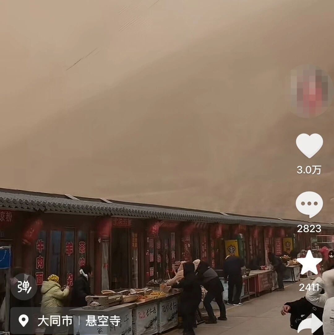 一位2月21日游览山西悬空寺的游客告诉红星新闻记者,天气从早上开始就不太好,他们在下午两点左右逛完下山时遇到大风。该游客拍摄的视频显示,山脚下黄沙漫天,大风将商户摆放的部分商品吹跑,商户在紧急按住自己的摊子。