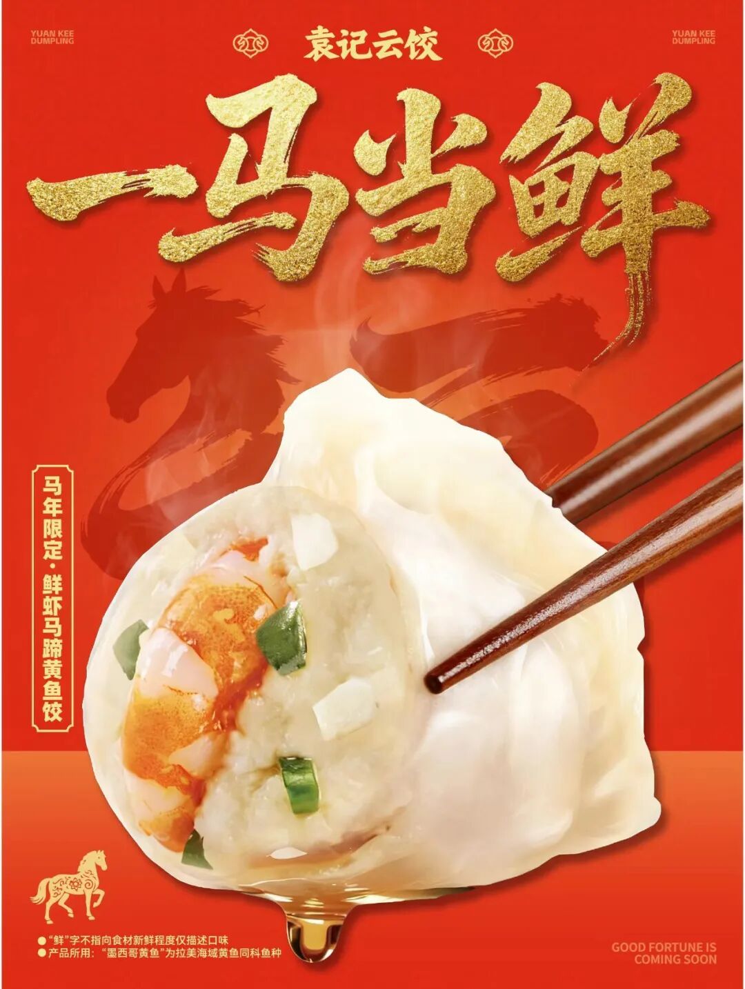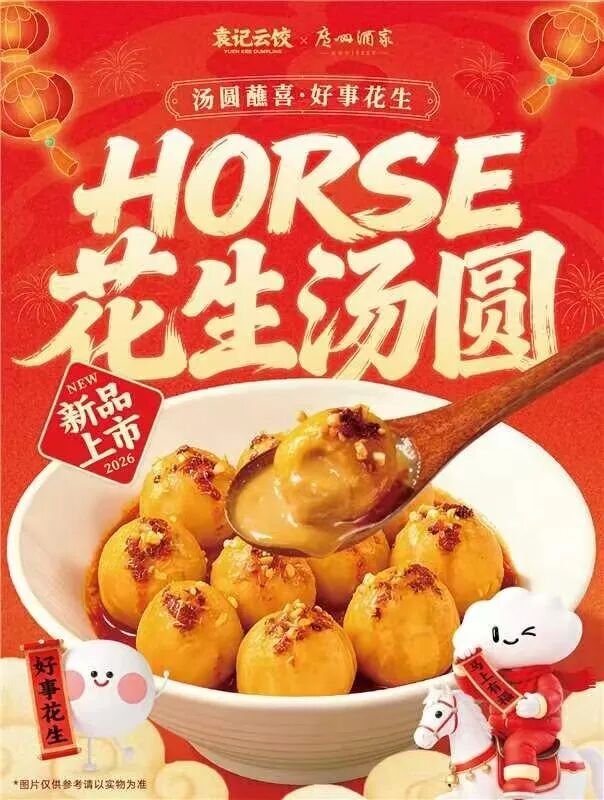 袁记云饺以持续的产品创新开启新年新篇,陆续上新了Horse花生汤圆、马年限定鲜虾马蹄黄鱼饺以及双虾鲜饺皇。