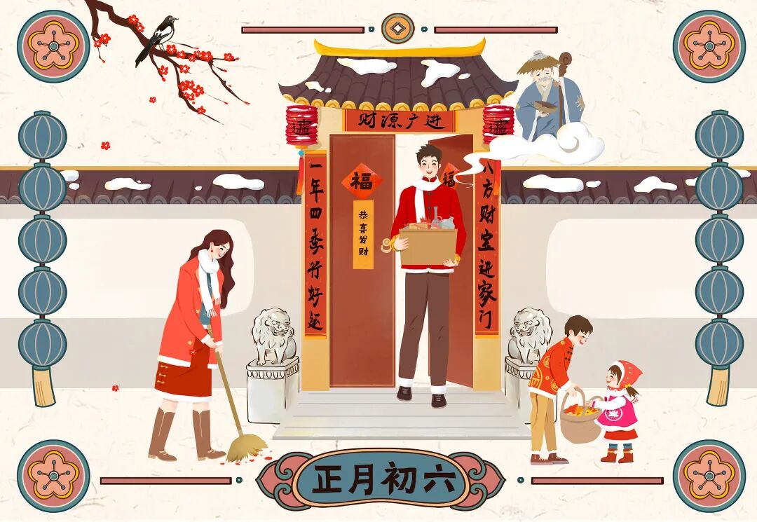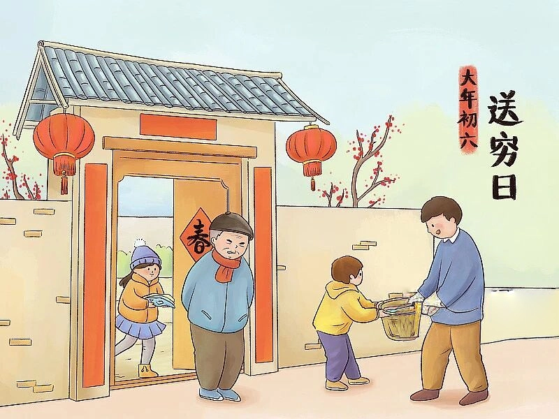 在古代,正月初六又称“送穷日”。据钱钟书《管锥编》考证,我国唐代民间便开始盛行送“穷鬼”,然而只称“鬼”而不称“神”。明清之后,“穷鬼”才被尊为“穷神”。正月初六,家中可以把节日积存的垃圾扔出去,门上的挂笺也可摘下来同时扔出去,叫作送穷。