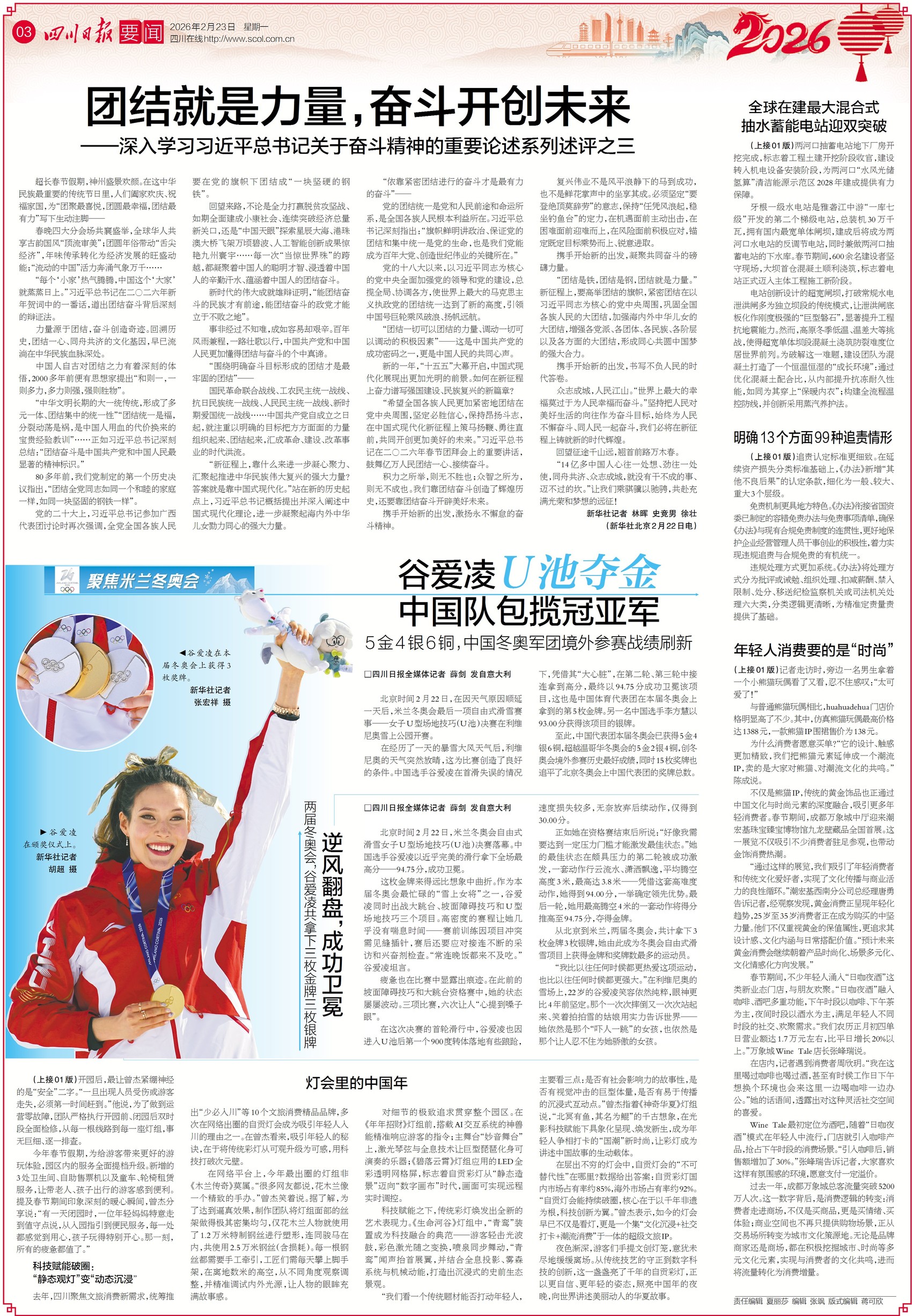 随着谷爱凌、李方慧2月22日包揽米兰冬奥会自由式滑雪女子U型场地技巧冠、亚军,中国代表团在本届冬奥会上已获得5金4银6铜,刷新冬奥会境外参赛历史最好成绩。中国军团此次共获15枚奖牌,追平了北京冬奥会上中国代表团的奖牌总数。看今天一版、三版,一睹中国冬奥军团风采。