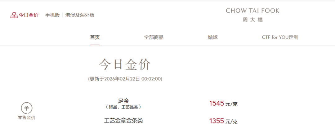 2月21日,现货黄金价格重回5100美元/盎司。国内黄金饰品价格对比显示,多家黄金珠宝品牌当日公布的境内足金首饰价格涨回至1500元上方。其中,周大福报价1545元/克,较上一日每克上涨46元;周六福报价1540元/克,较上一日每克上涨46元;周生生报价1550元/克,较上一日每克上涨48元。