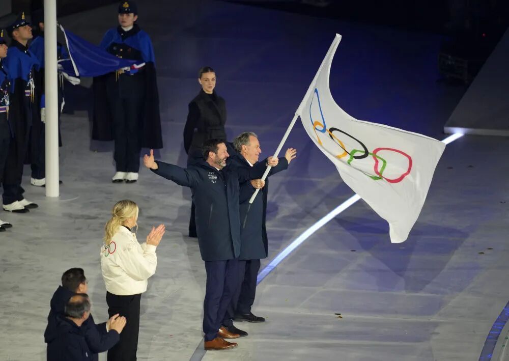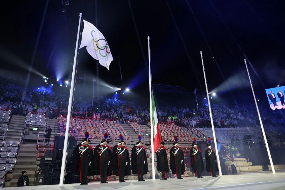 意大利国旗与国际奥委会会旗在闭幕式现场升起。