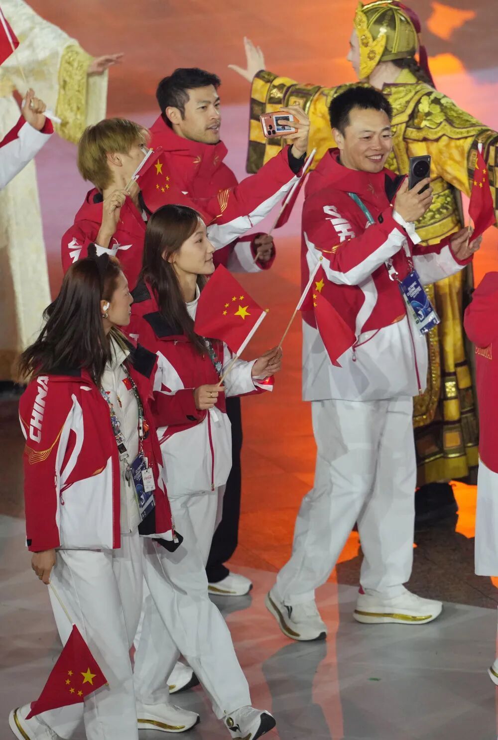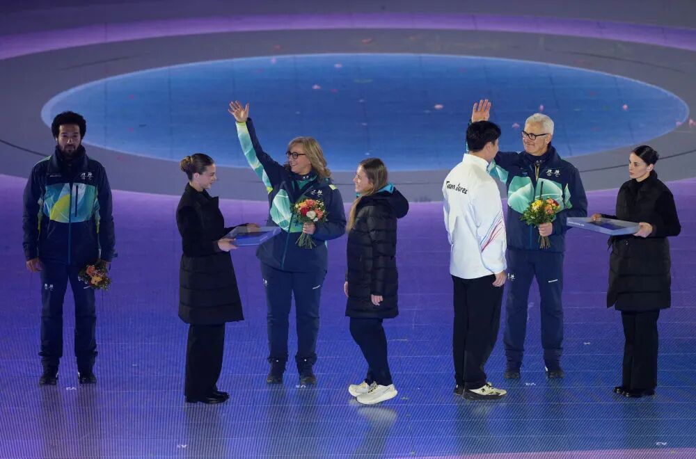 中国速度滑冰运动员殷琦(右)在闭幕式入场。
