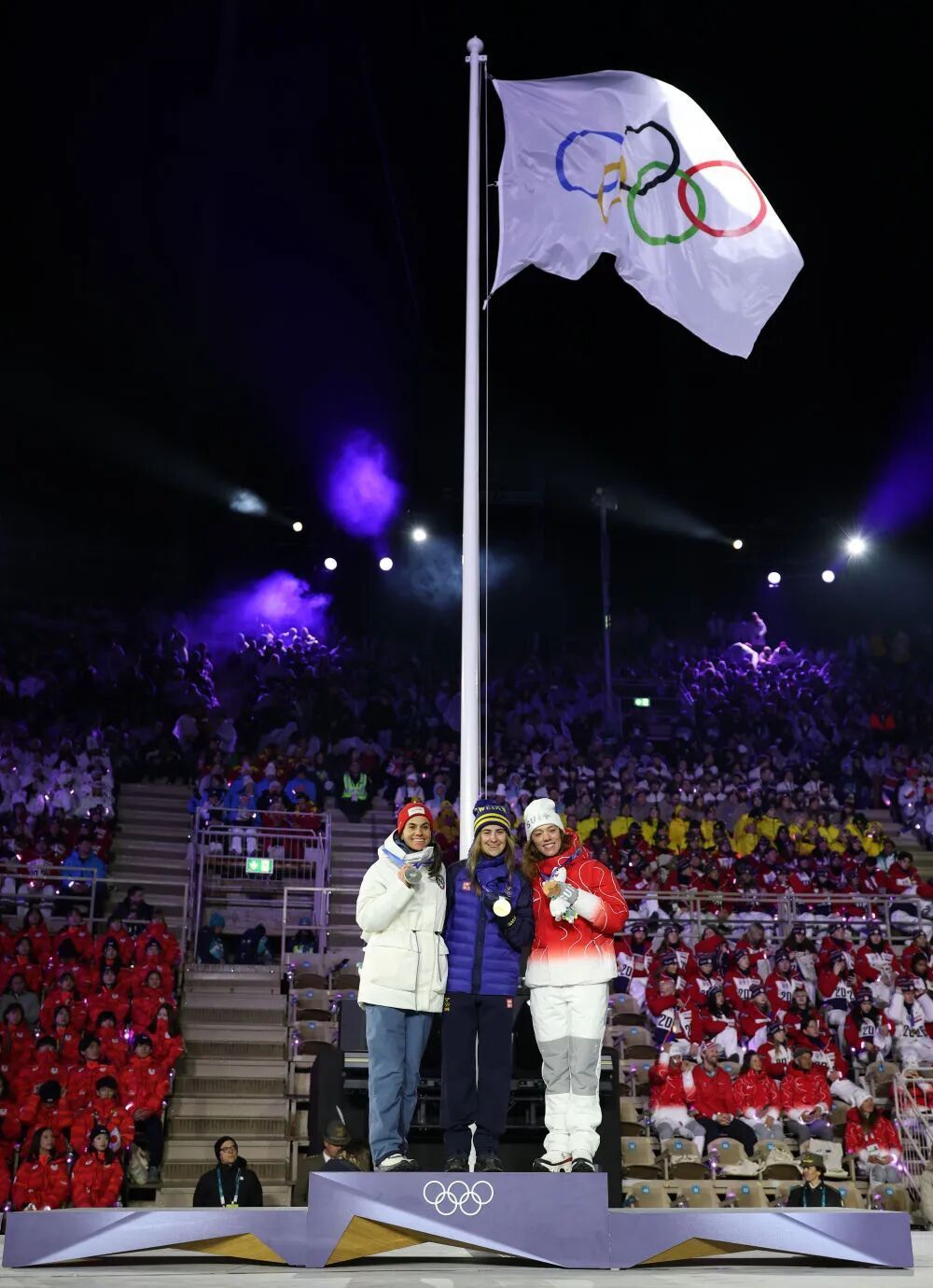 越野滑雪女子50公里集体出发(传统技术)冠军瑞典选手埃芭·安德森(中)、亚军挪威选手海迪·文格(左)、季军瑞士选手纳迪亚·凯林在闭幕式上的颁奖仪式中合影。