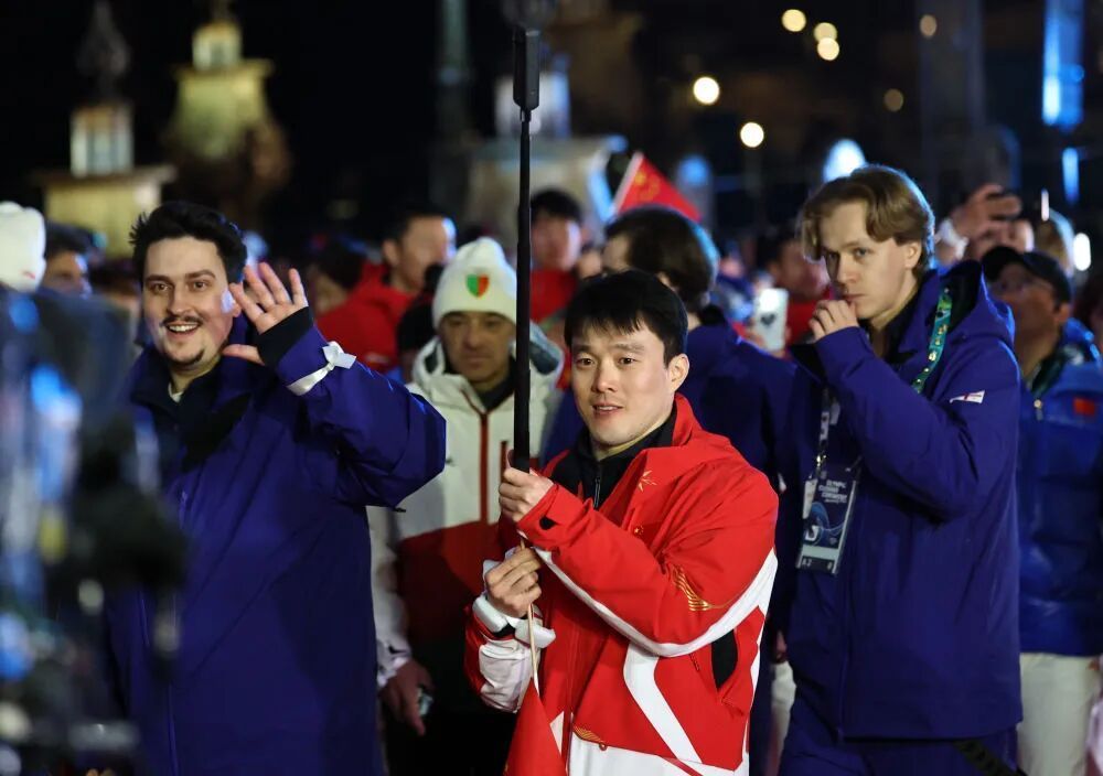 中国速度滑冰运动员宁忠岩在闭幕式入场。