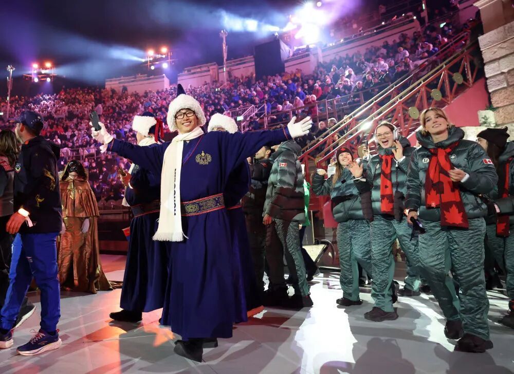 中国自由式滑雪运动员齐广璞(中)在闭幕式入场。