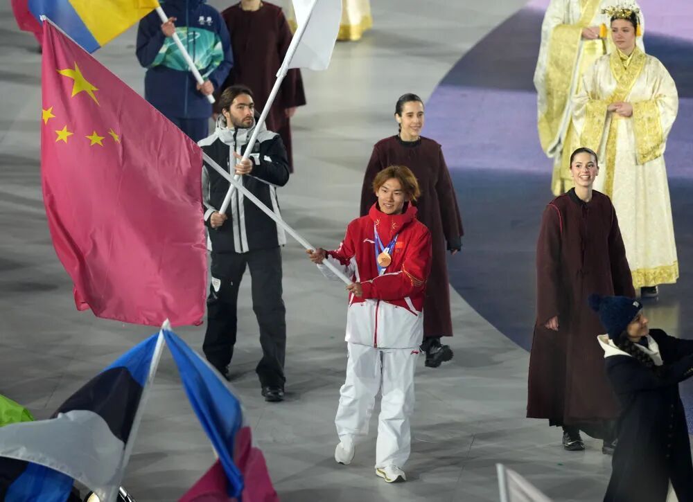 中国体育代表团旗手苏翊鸣在闭幕式上入场。