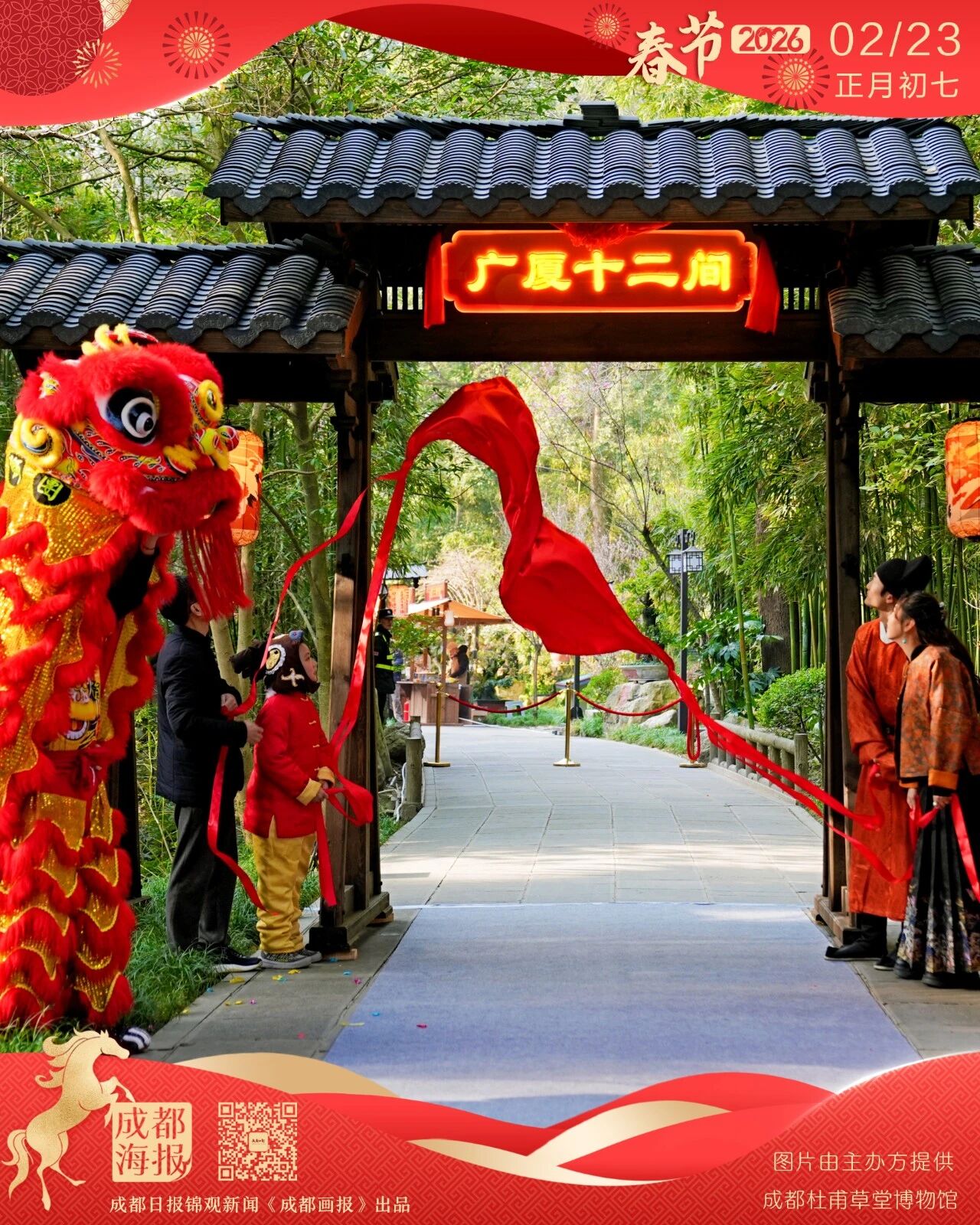 新春时节,成都杜甫草堂博物馆的花事最动人。正门中轴线、盆景园、梅园、寻香道暗香浮动,兰园幽雅清芬,一枝枝、一丛丛,在冬尽春来的时刻,悄然托起锦官城的春意。2月13日上午,杜甫草堂万佛楼前锣鼓初响,“大雅中国年 人日游草堂”成都杜甫草堂博物馆春节系列文化活动正式启幕。自正月初一至初七,万佛楼与大雅堂每日轮番呈现曲艺、民乐、木偶、变脸、朗诵等传统艺术专场。四川清音、扬琴竹琴、评书相声与古诗吟诵交相辉映,让新春七日,日日有戏、场场不同。记者 王嘉 图片由主办方提供制图 曹劲松 严瑾编辑 李怀英审核 郑涵