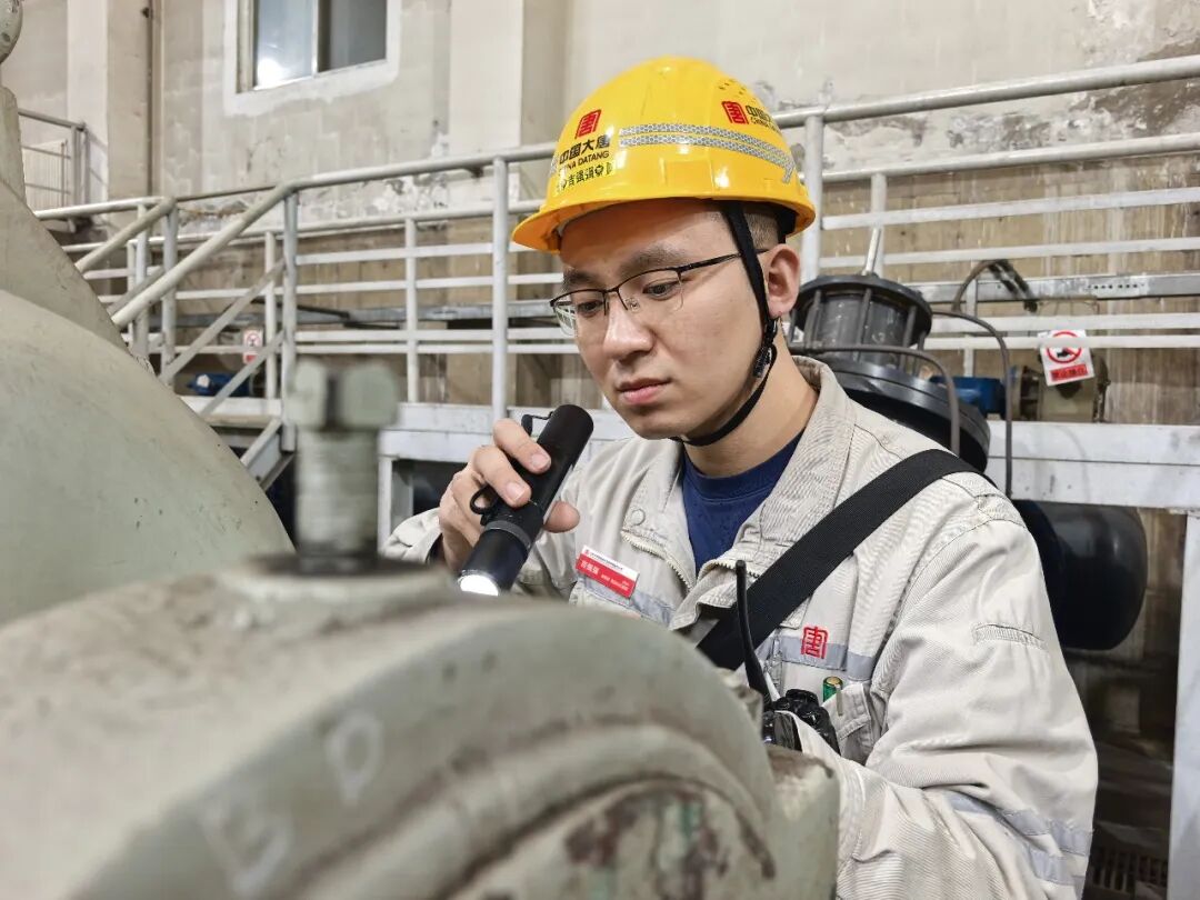 ▲发电部工作人员吉强强手持强光手电,对重要辅机设备的关键位置进行巡检。