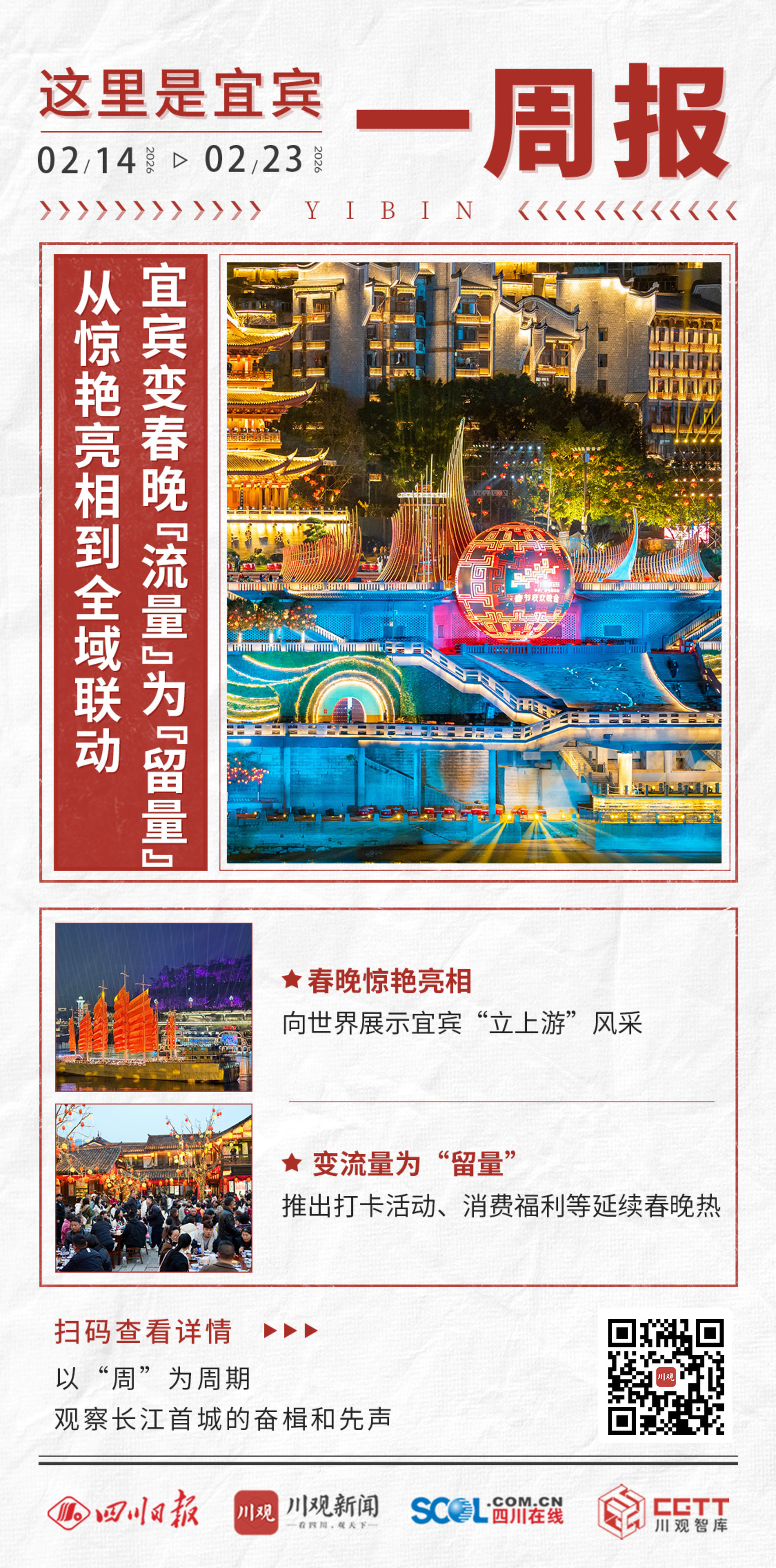 2026年第八周(2月14日—2月23日),适逢史上最长九天春节假期,因春晚精彩亮相而成为“顶流”的长江首城宜宾,热度持续飙升,喜庆祥和的节日氛围弥漫三江六岸。