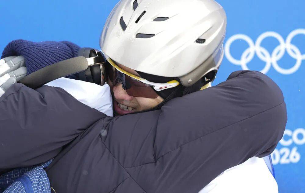 2月20日,王心迪(右)和妻子徐梦桃在比赛中拥抱。图据新华社