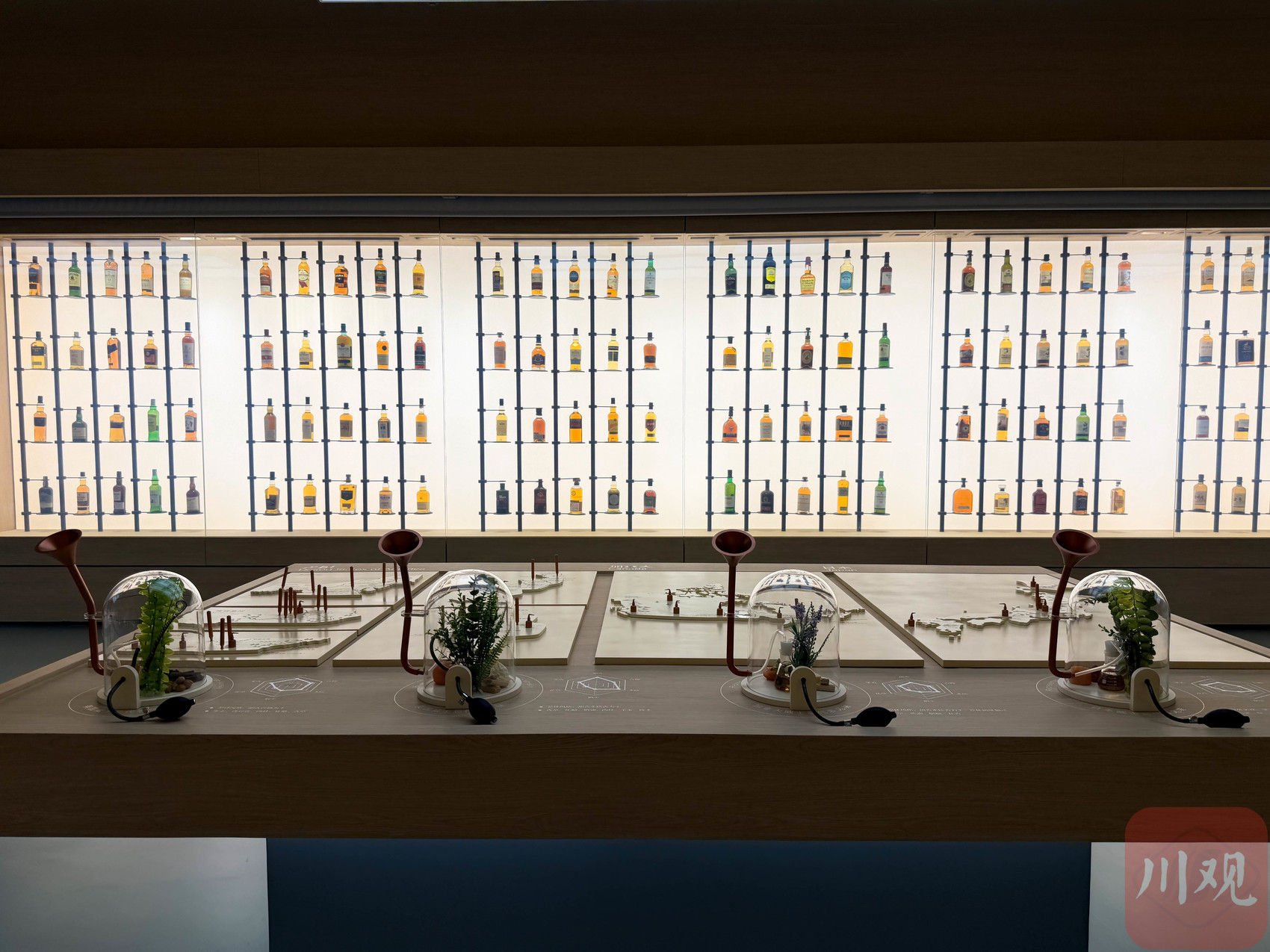 “世界馆”则打破传统陈列模式,成为趣味科普空间。代表爱尔兰、苏格兰、印度等产区的风味球错落摆放,轻轻一挤,就能闻到各地威士忌的独特香气,展现全球产区差异。记者选择了爱尔兰产区,轻轻挤压放在面前的小球,凑近一闻,威士忌味道就缓缓飘出:以果香谷物为主,混合着柑橘、苹果、麦芽、烟熏和泥煤的味道。