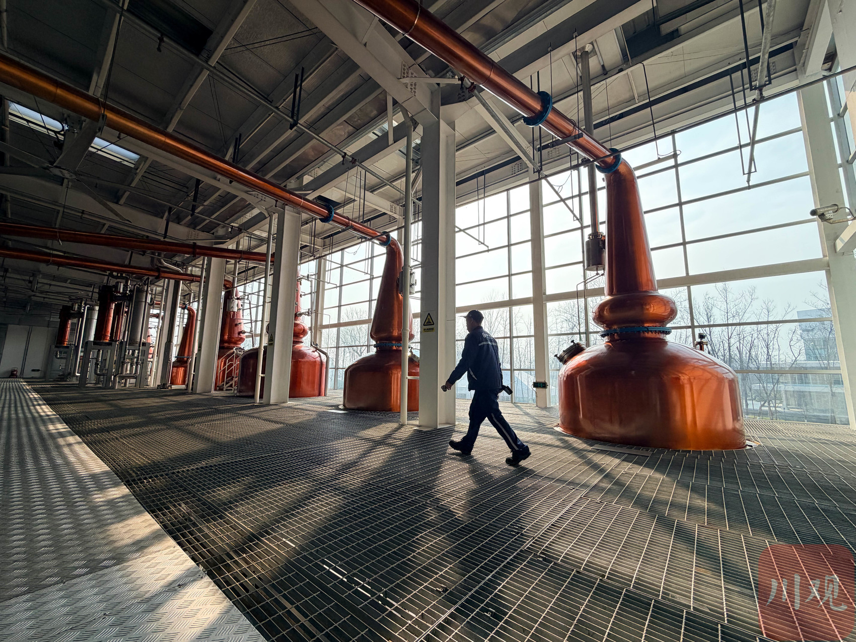 厂区相关负责人介绍,整个生产线及体验中心占地约227亩,是中国目前规模最大的威士忌酒厂。一条曲径通幽的“崃州之道”串联起各个体验场馆,绿树环绕;标志性的蒸馏塔建筑线条利落,与川西风貌景观相映成趣,现代工业美学与自然诗意相融。