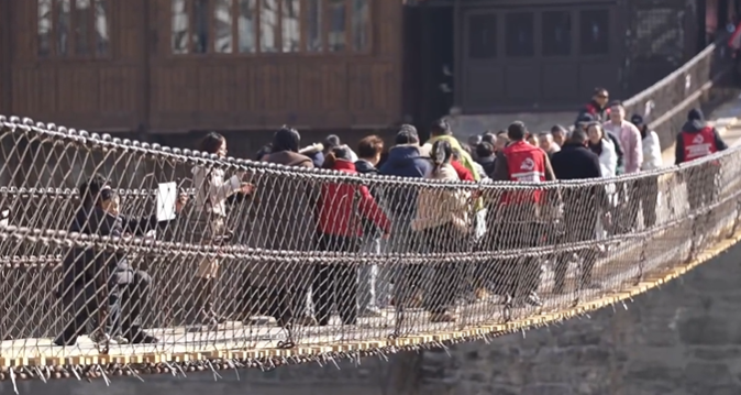 大年初一游客到泸定桥打卡。(泸定县融媒体中心供图)