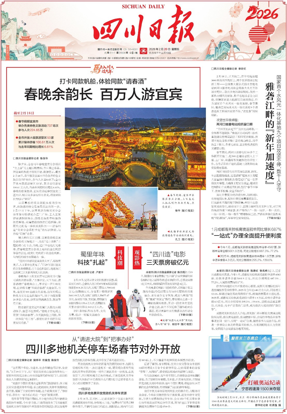 最近,川渝两地发布了《川渝地区党政机关停车资源对外开放服务管理规范》,倡议各地开放党政机关停车资源。绵阳2025年开始探索节假日期间党政机关停车资源对外开放工作,今年春节期间,绵阳全市机关事业单位免费开放内部停车场,涉及车位27000多个,当地还将对外地车辆首次轻微交通违法实行“首违免罚”的柔性执法。2月20日《四川日报》头版报道了绵阳全市机关事业单位对外免费开放内部停车场。(点击阅读:从“一位难求”到“请进大院”:四川多地机关停车场春节对外开放的背后丨川观深度)