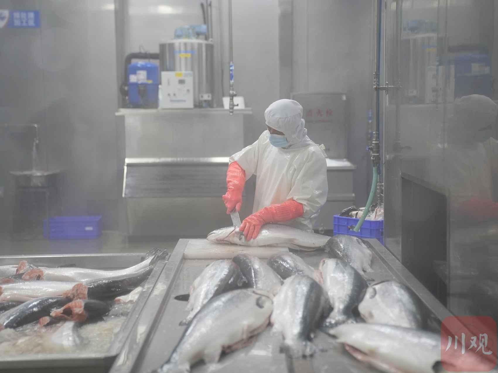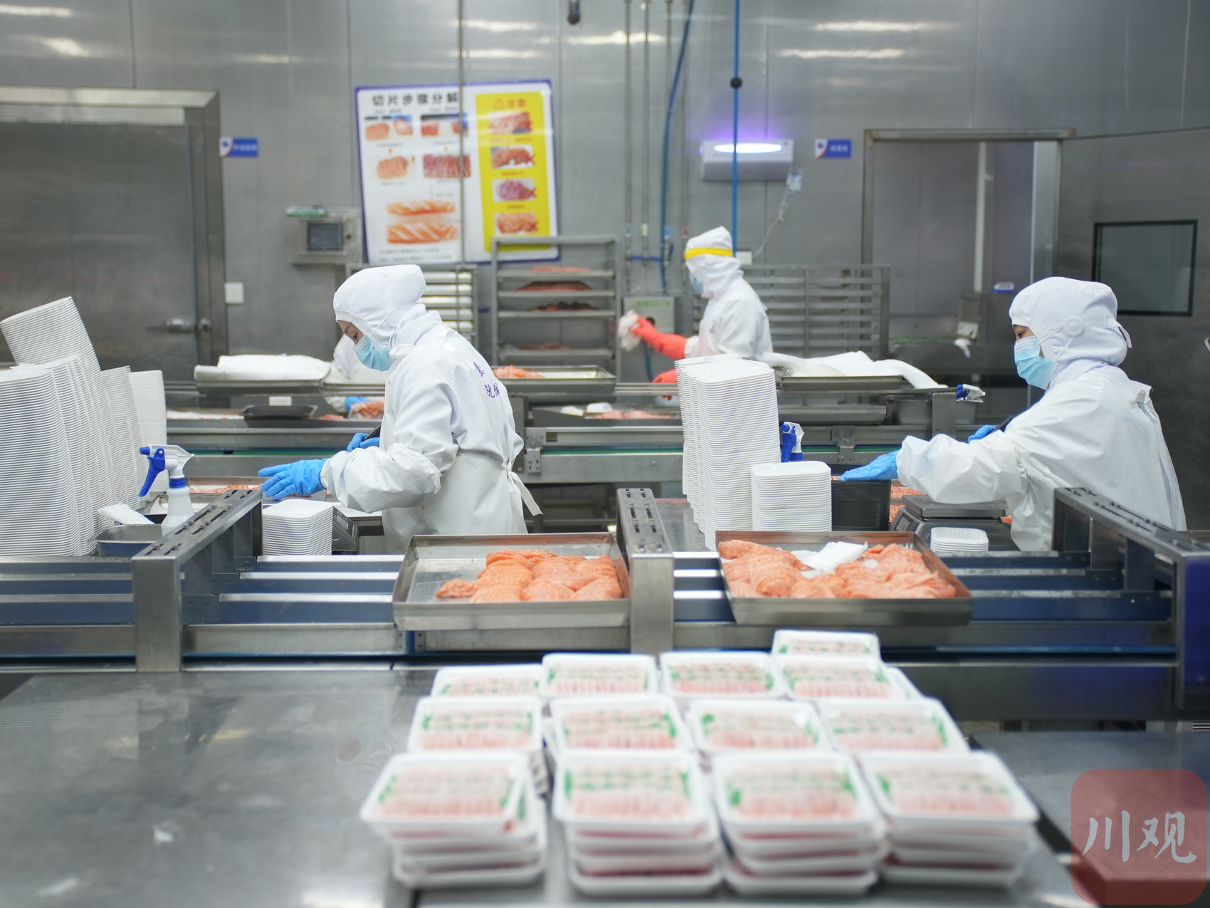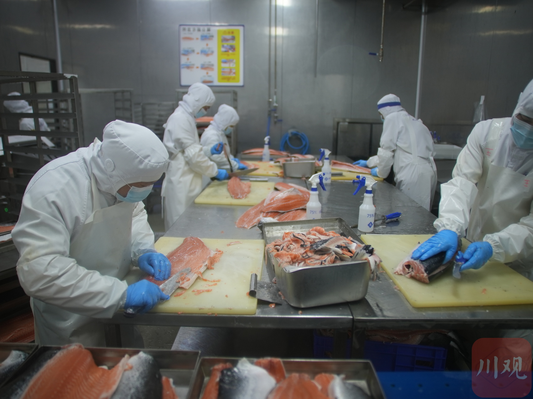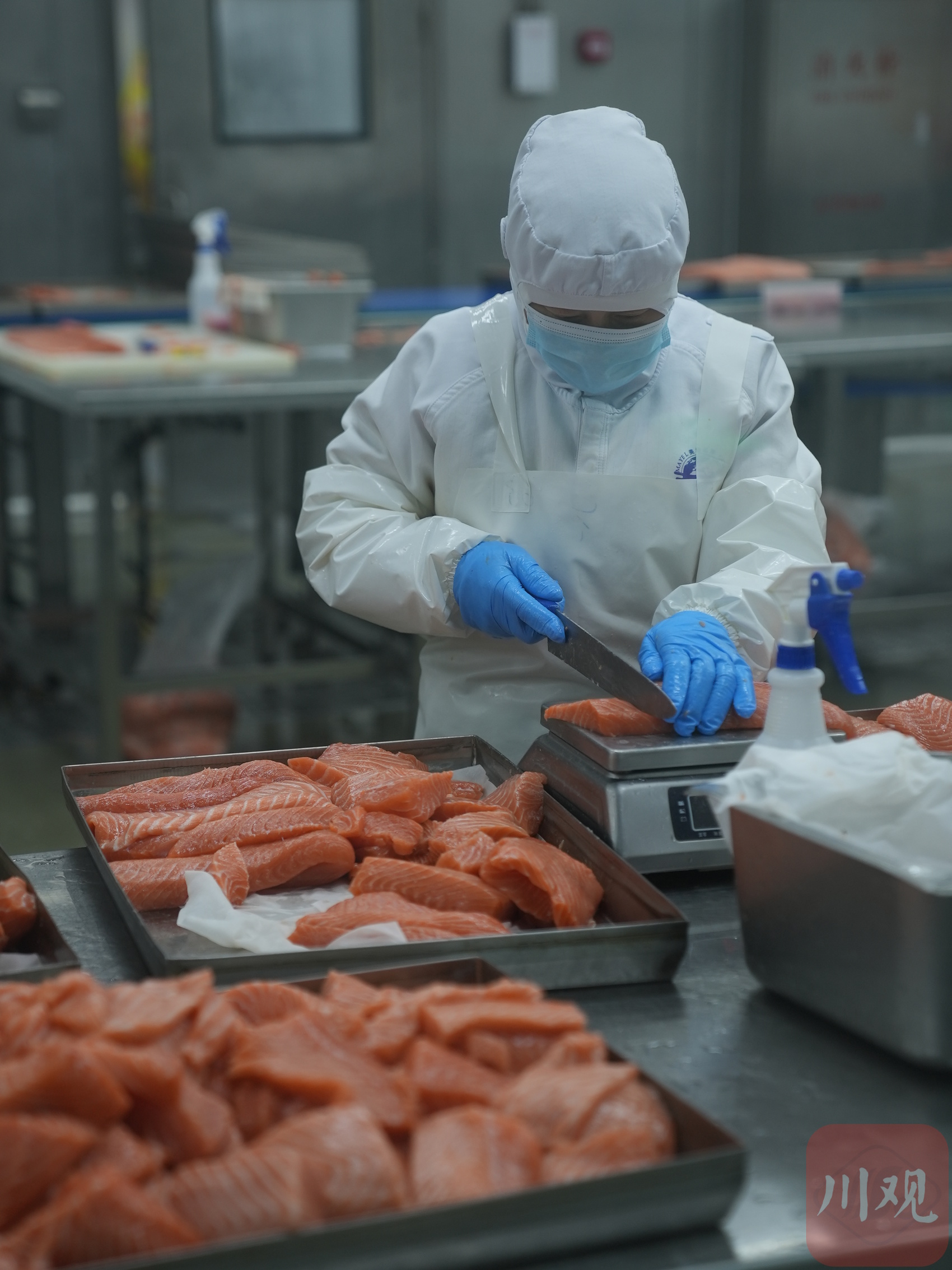 2月23日,农历正月初七,在位于成都双流区西部生鲜港的四川美沿远洋食品有限公司里,进口冰鲜三文鱼加工生产线满负荷运转。一条条重达约7公斤的冰鲜三文鱼不停被运转上产线,数十名工人熟练地进行开片、修整、分切、封装、X光检查等工序,最后经过贴标的生鲜立即被发往成都各大商超和料理店。
