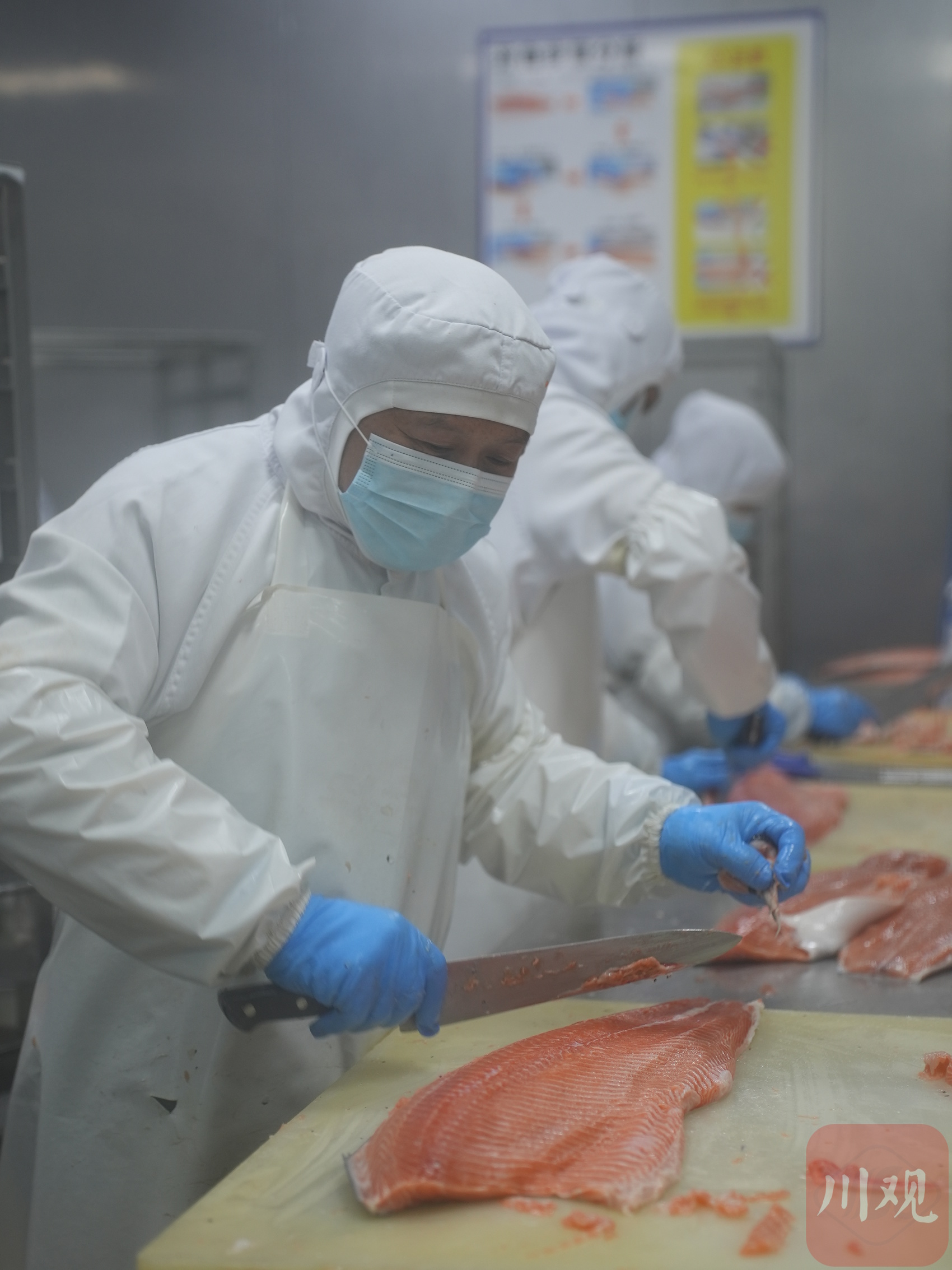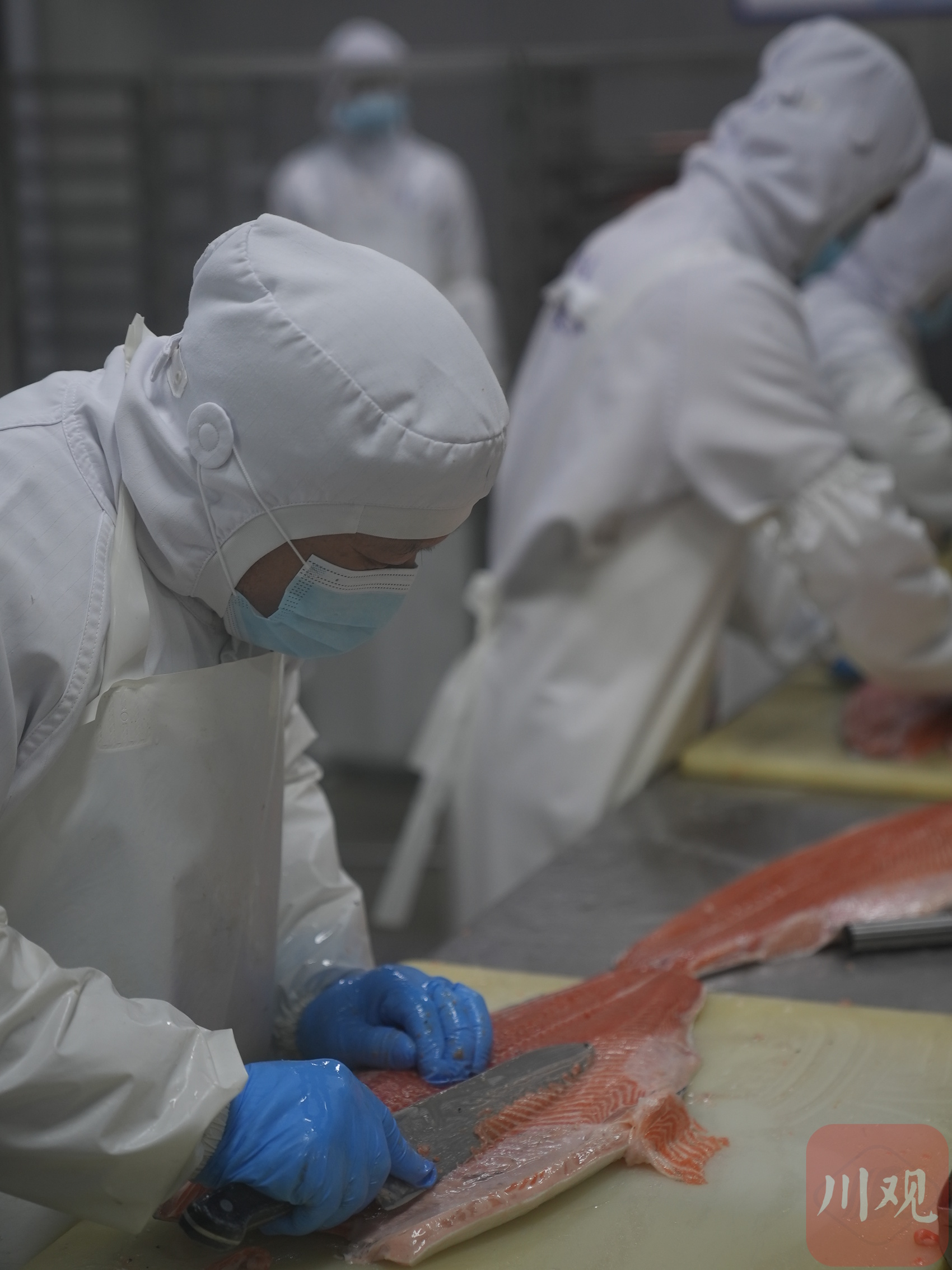 2月23日,四川美沿远洋食品有限公司,工人对进口冰鲜三文鱼进行开片和去膜处理。
