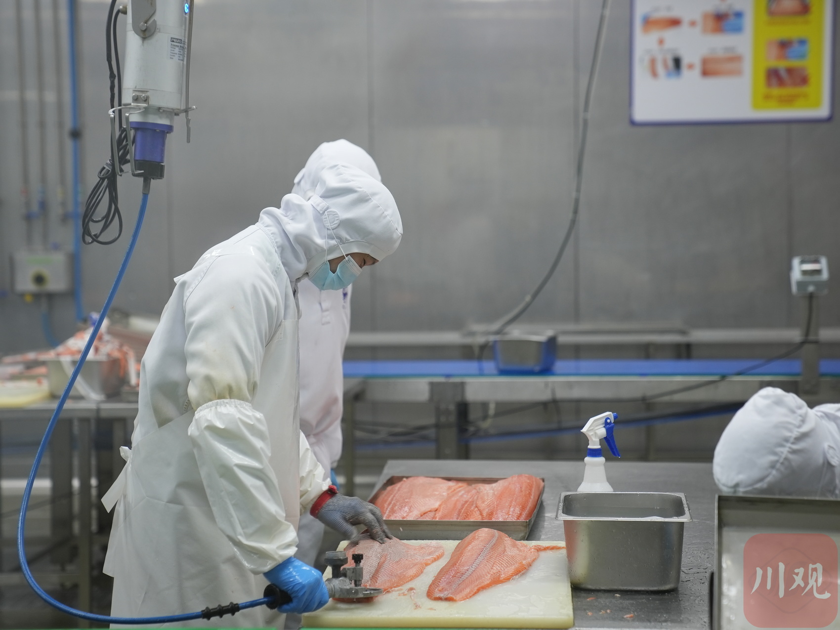 2月23日,四川美沿远洋食品有限公司,进口冰鲜三文鱼加工生产线满负荷运转,工人对三文鱼进行切头处理。