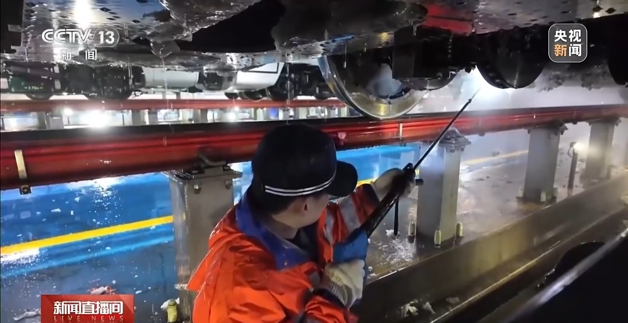 国铁哈尔滨局哈尔滨动车段地勤二检组工长 张朔:通过恒温恒压出水,配合扇形喷头设计,过去完成一组动车组融冰除雪需耗时六小时,如今仅需三小时。提升效率的同时保障了动车组安全运行。