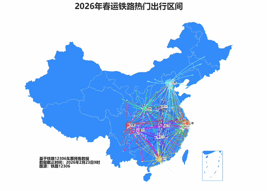 截至2月23日8时,铁路12306(含网站、客户端等,下同)已累计发售春运期间火车票3.39亿张。从预售情况来看,今日主要热门出发城市有广州、北京、成都、武汉、重庆、西安、郑州、上海、杭州、南昌;主要热门到达城市有北京、上海、广州、深圳、成都、杭州、武汉、西安、重庆、郑州;南宁至广州、北京至上海、武汉至上海、沈阳至北京、深圳至香港、武汉至深圳、西安至成都、南昌至上海、武汉至广州、太原至北京等热门区间客流相对集中。从余票情况看,2月24日至3月3日,长沙往返深圳,上海至温州、合肥、武汉、徐州,广州至长沙,北京至郑州,南宁至广州,西安至北京等区间余票充足;成都至昆明、上海,郑州至广州,福州至北京,上海至连云港、商丘,青岛至北京,南昌至北京,西安至兰州,厦门至深圳等区间尚有余票,旅客朋友可及时通过铁路12306查询和购票。