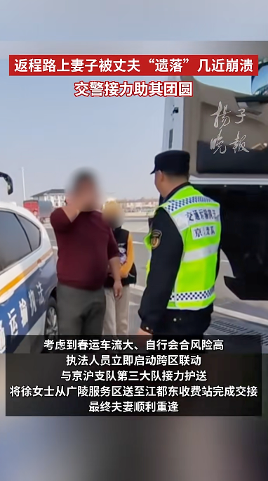 “您别着急,我们马上帮您联系!”执法人员一边耐心安抚徐女士的情绪,一边想方设法联络其丈夫。经紧急查询沟通,最终成功联系上已驾车抵达京沪高速高邮服务区的蔡先生。此时他才惊觉妻子被“遗落”,懊悔不已,当即表示立即停车等候。