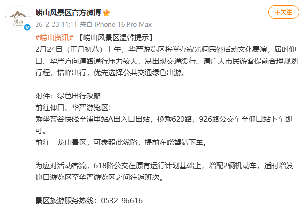 2月24日(正月初八)上午,华严游览区将举办寂光洞民俗活动文化展演,届时仰口、华严方向道路通行压力较大,易出现交通缓行。请广大市民游客提前合理规划行程,错峰出行,优先选择公共交通绿色出游。