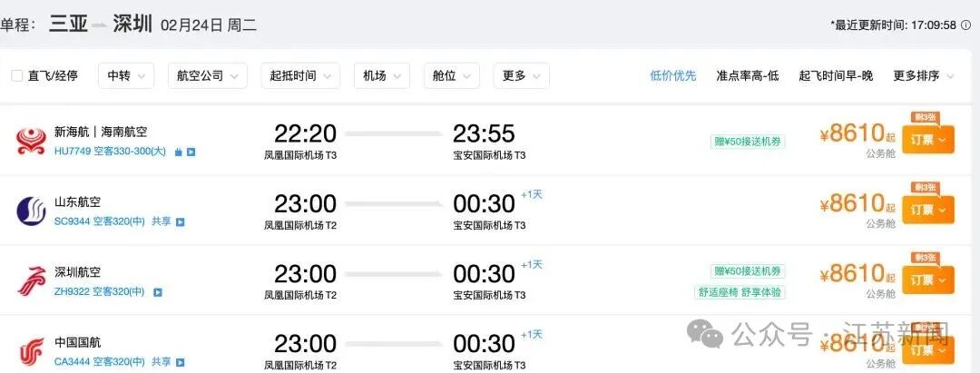 与此同时,三亚至广州的直飞航班在23日已显示“售罄”;旅客只能选择耗时更久、价格仍高达近万元的中转方案。深圳航线也不例外,2月22日、23日三亚飞往深圳的直飞机票全部售罄,一直到24号(周二)才有直飞深圳的航班,售价仍超8000元。