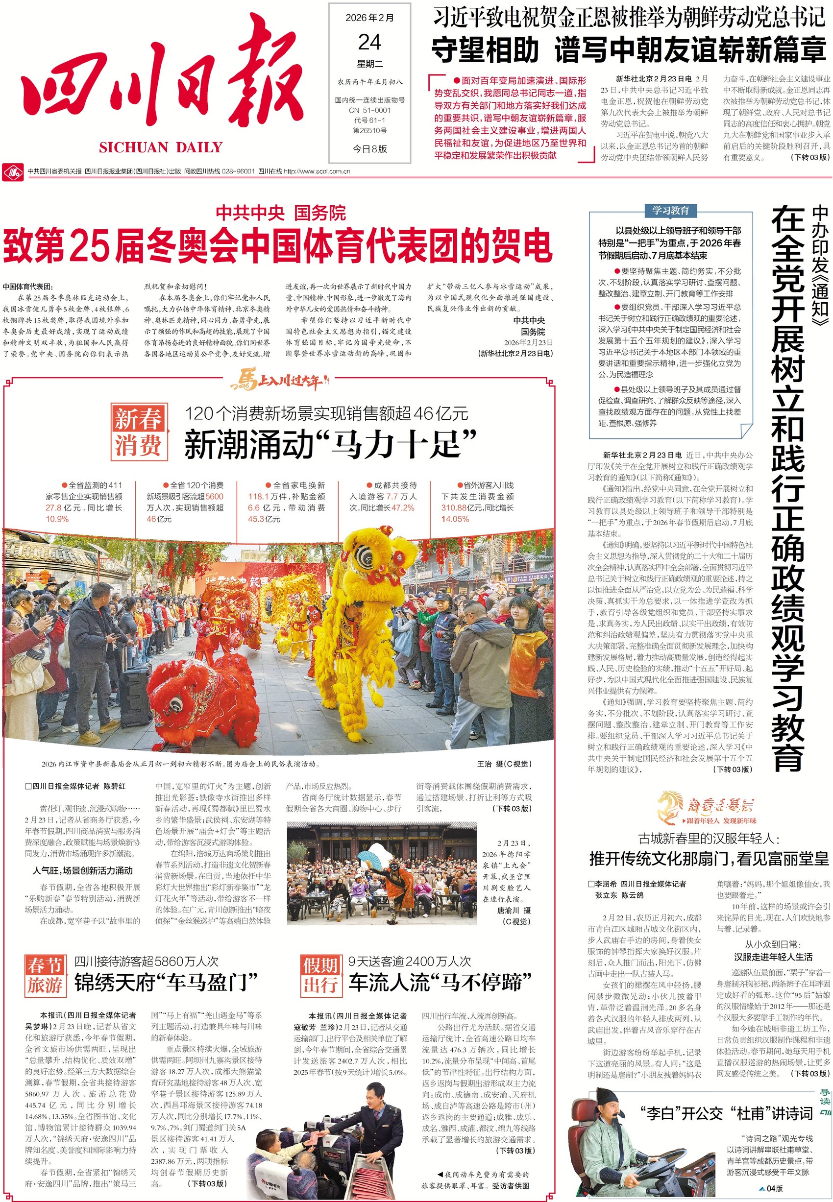这个春节假期,四川消费市场热力十足。全省120个消费新场景吸引客流超5600万人次,实现销售额超46亿元。以旧换新政策给力,带动家电、数码产品销售大幅增长,科技年货成了春节消费新风景。入境游同样火爆,成都入选外国游客最青睐的“入境游首站”前三。详情关注今日一版。