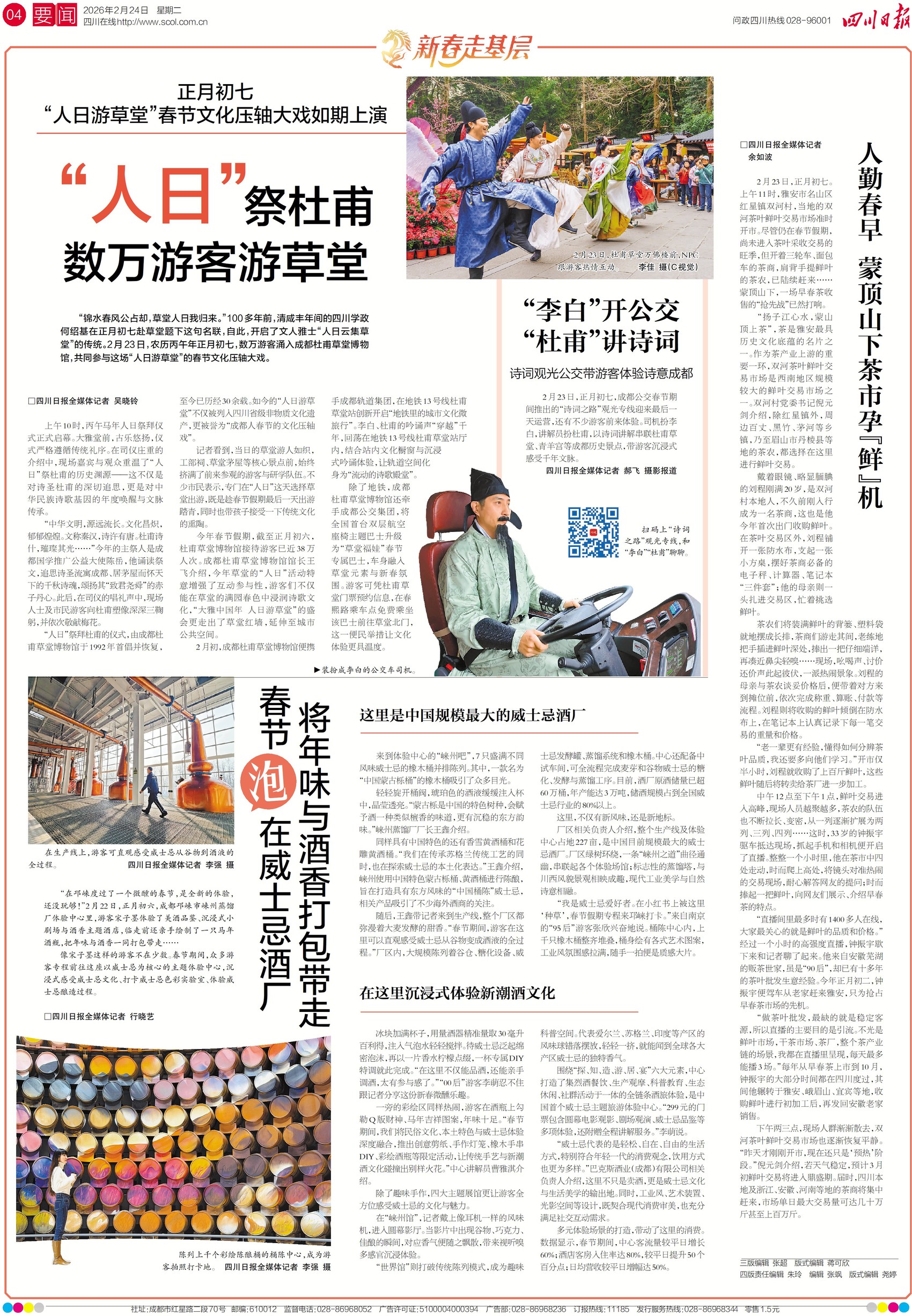 2月23日正月初七,成都杜甫草堂迎来了一年中最热闹的日子——上万游客涌入这里,参加持续了三十多年的“人日游草堂”祭拜诗圣仪式。大家踏青赏春,敬献梅花,感受传统文化的熏陶。这项始于清代的习俗,正成为成都人春节的文化压轴戏。详情关注今日四版。