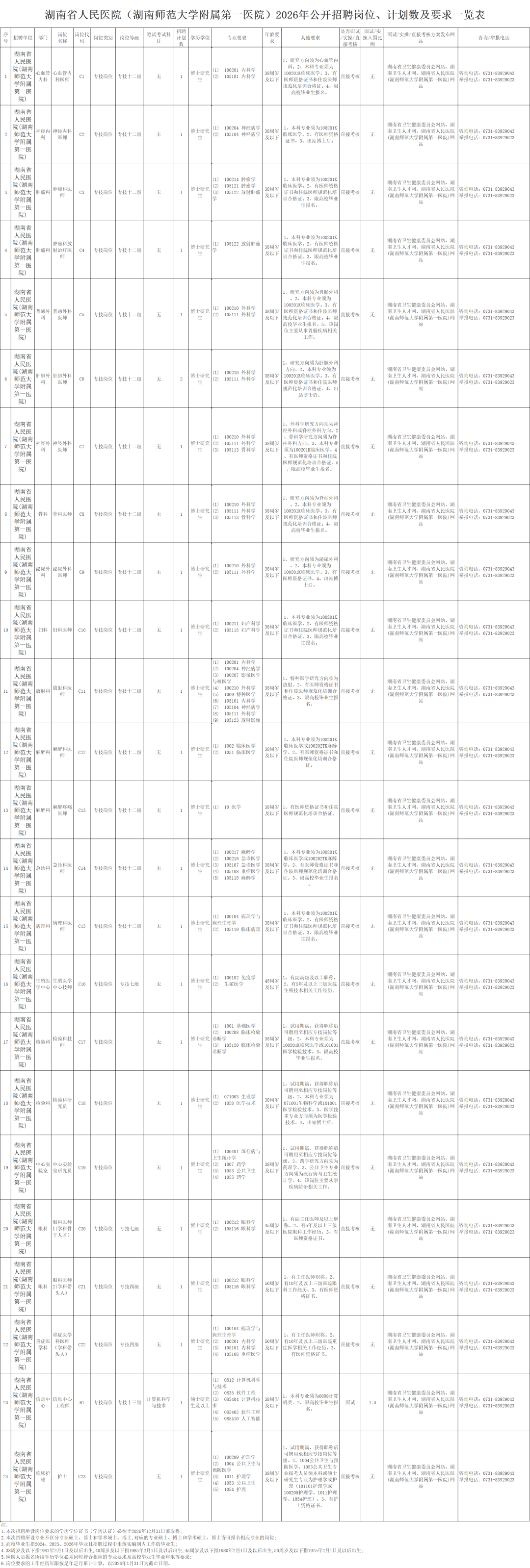 报名时间 A、B类岗位:报名时间为2026年2月26日至2026年3月5日。C类岗位:报名时间为2026年2月26日至2026年12月31日,随到随招,招满即止。报名方式 应聘人员登录湖南卫生人才网招聘报名系统进行报名。湖南省人民医院(湖南师范大学附属第一医院)2026年公开招聘公告招聘岗位