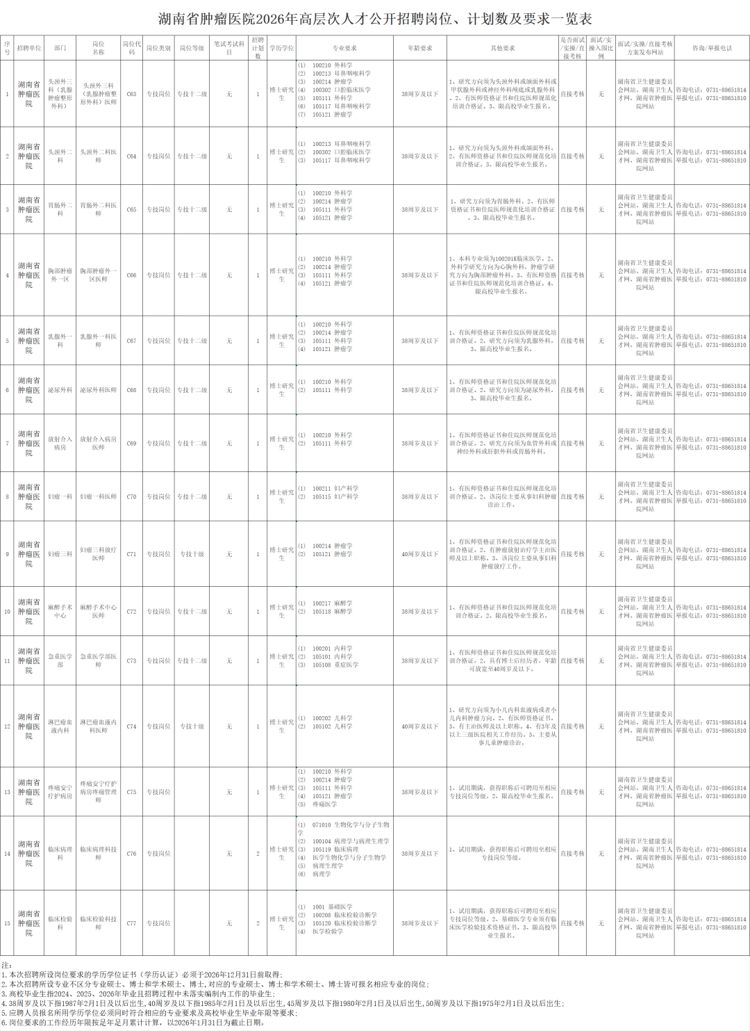 报名时间 B类岗位:报名时间为2026年2月26日至2026年3月5日。C类岗位:报名时间为2026年2月26日至2026年12月31日,随到随招,招满即止。报名方式 应聘人员登录湖南卫生人才网招聘报名系统进行报名。湖南省肿瘤医院2026年高层次人才公开招聘公告招聘岗位